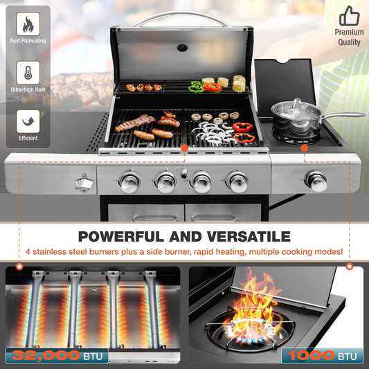 4-Burner Stainless Steel Propane Gas Grill with Side Burner