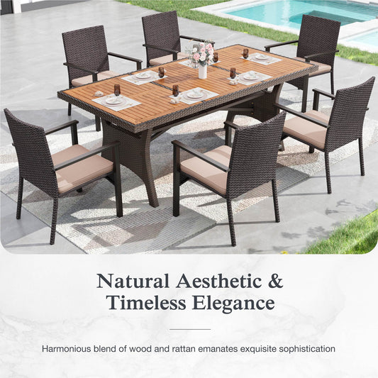 Alpha Joy 7-Piece Outdoor Patio Dining Set Wicker Rattan Chairs and Acacia Wood Table Set for 6 Person, Beige
