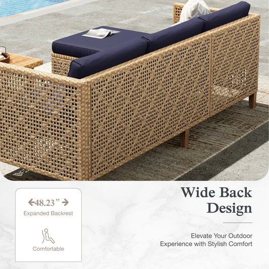 Alpha Joy Wicker Patio Furniture Conversation Set Boho Style Outdoor Sofa with Coffee Table and Navy Blue Cuchions
