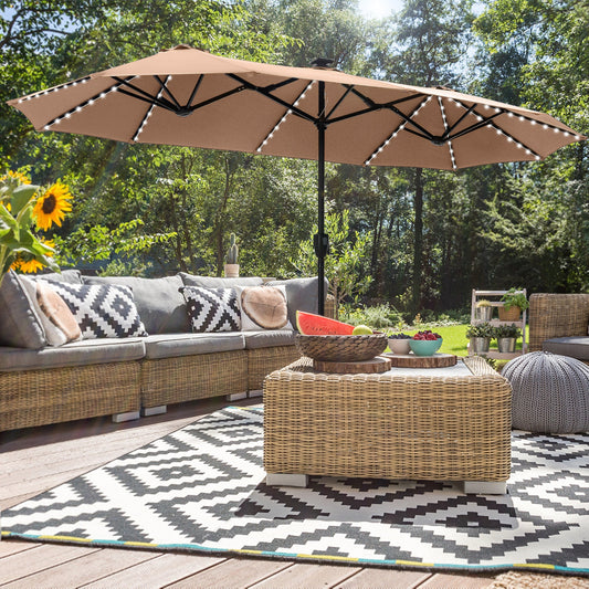 Alpha Joy 13ft Large Double-Sided Outdoor Patio Umbrella with Colorful Solar Lights, Beige