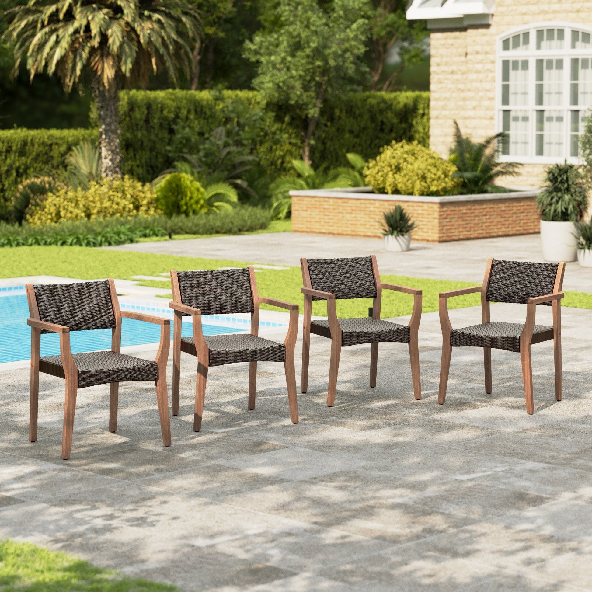 Sophia & William Wicker Rattan Outdoor Patio Dining Chairs with Acacia Wood Structure - Set of 4, Dark Brown