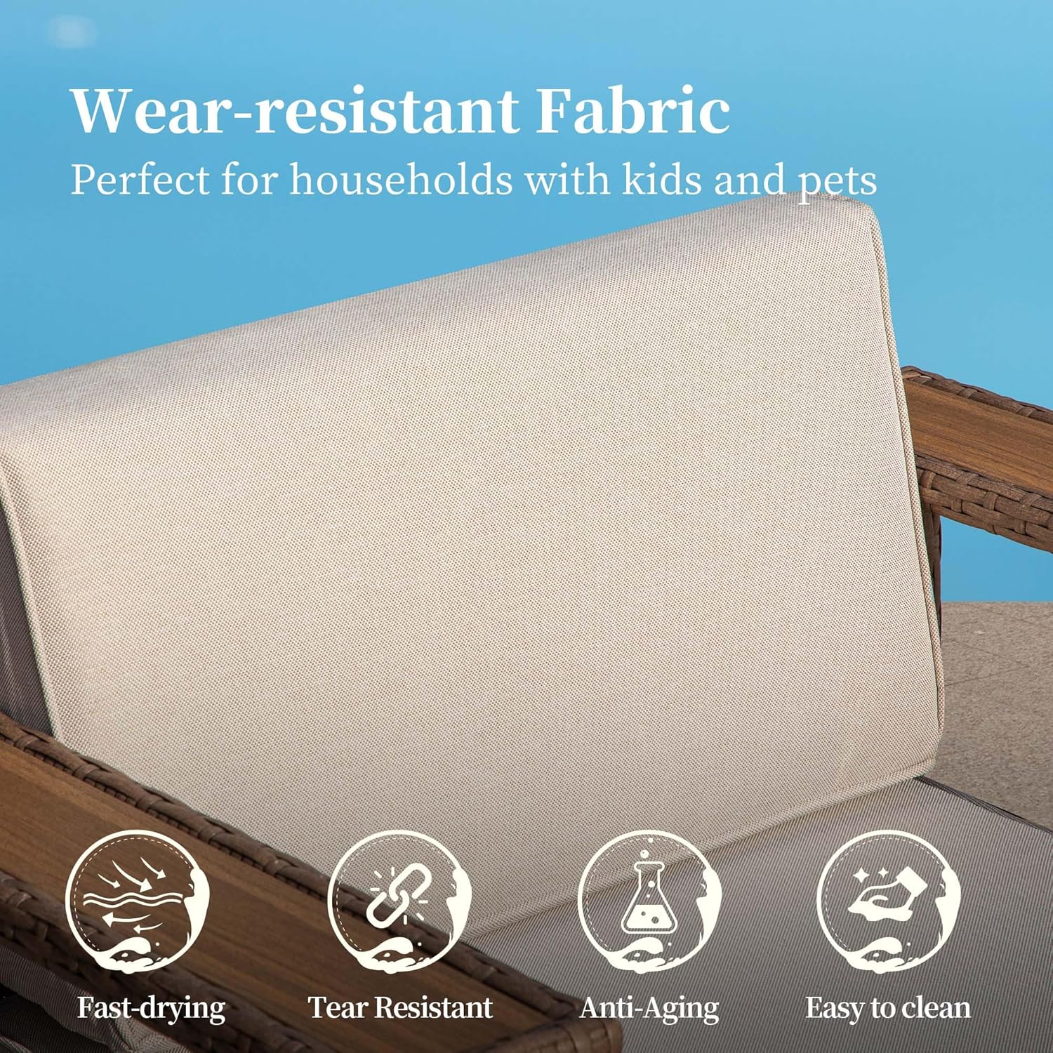 · Waterproof All-Weather Fabric:Crafted with premium spun fabric, this patio furniture set is waterproof,soil-resistant,and UV resistant—all while staying effortlessly easy to maintain. Spend more quality moments outdoors with your loved ones, and less time worrying about cleanup