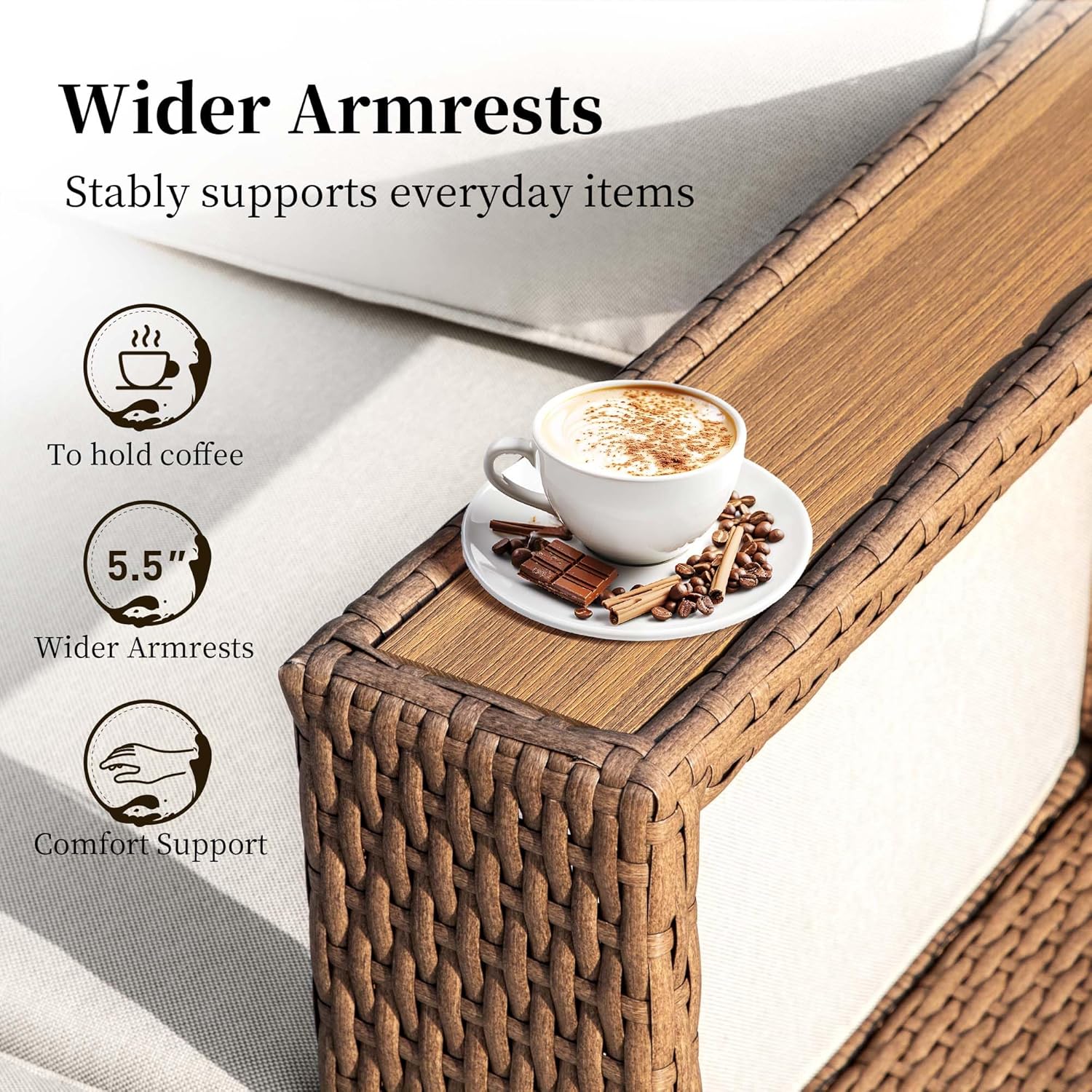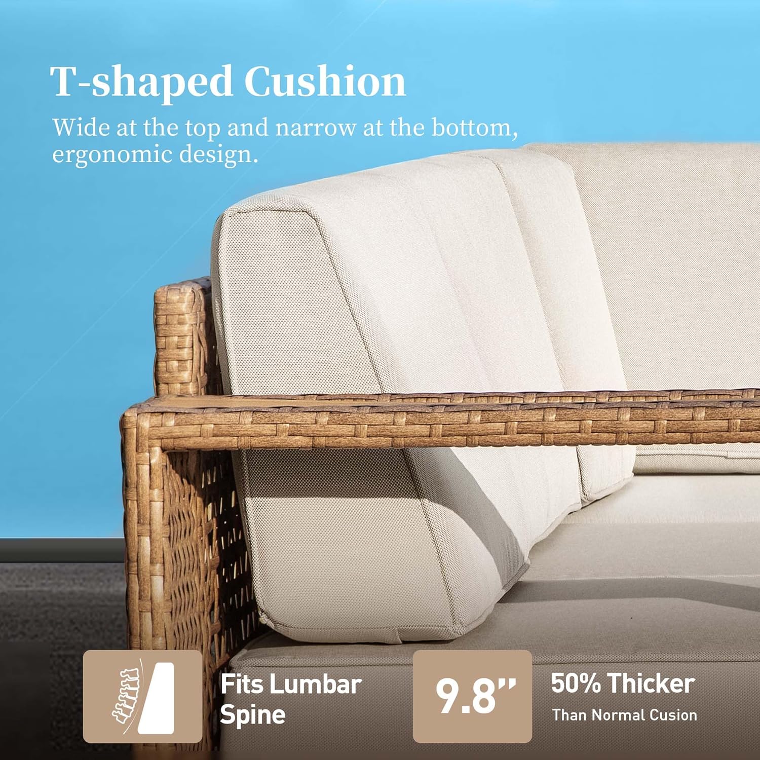· Ergonomic Support,Stylish Design:Experience ultimate comfort with our L-shaped outdoor sectional, featuring widened 5.32-inch armrests for enhanced arm support and a unique T-shaped backrest that contours to your back for healthier posture. Crafted from durable rattan and wood-plastic composite, its elegant neutral design seamlessly complements any patio, garden, or balcony while adding a modern touch