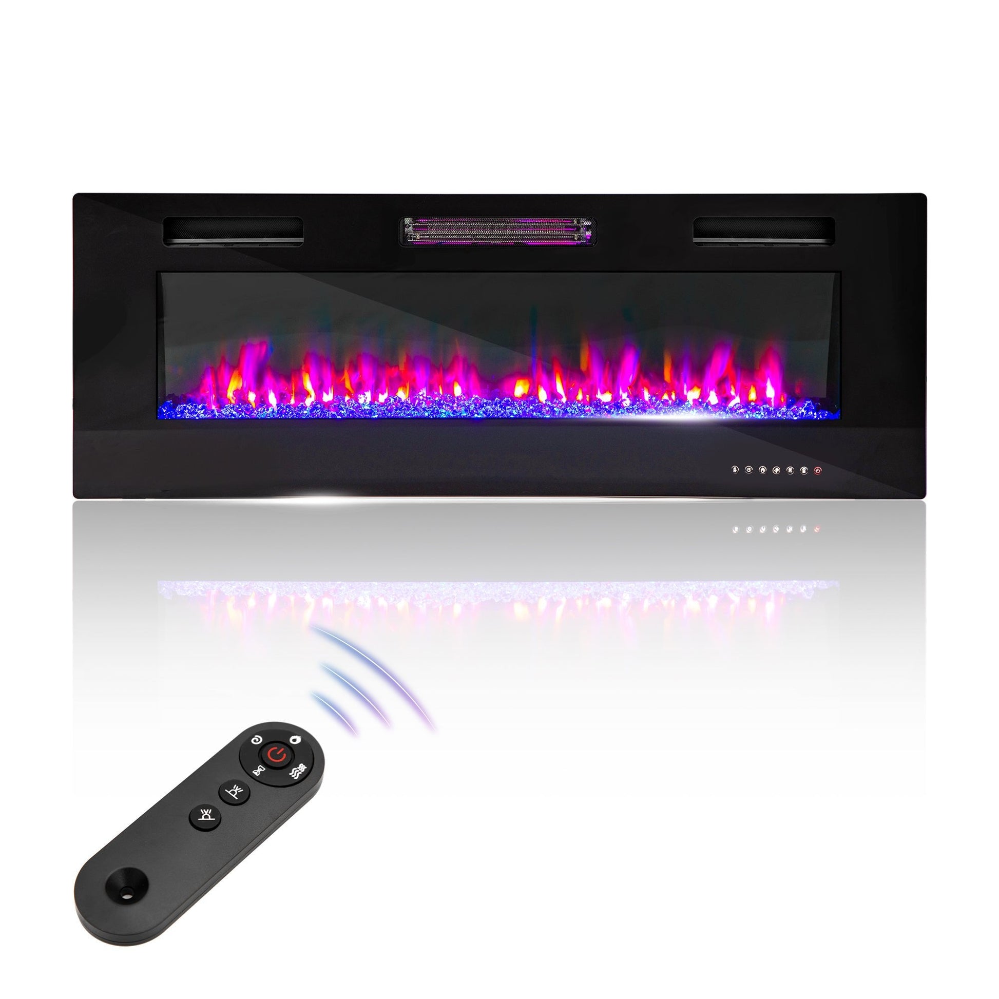 Our 60" linear electric fireplace is an ideal decoration to warm your home and life. Linear fireplace in sturdy structure with high quality fempered glass, adds pretty realistic flames and awesome heat in your home. You could combine multiple colors, there are 12 flame colors, 12 led bed colors, 5 flame speed and brightness can be adjusted freely. Equipped with touchscreen and remote control, you can easily adjust the temperature, change the flame and switch on/off. Additionaly, the timer is from 1 to 8 hours, you can set the time when you sleep. The heat noise is less than 35DB, and when the home is super heat, the fireplace will start its auto-heat kill safety function, so it is suitable for home, safe and cozy.