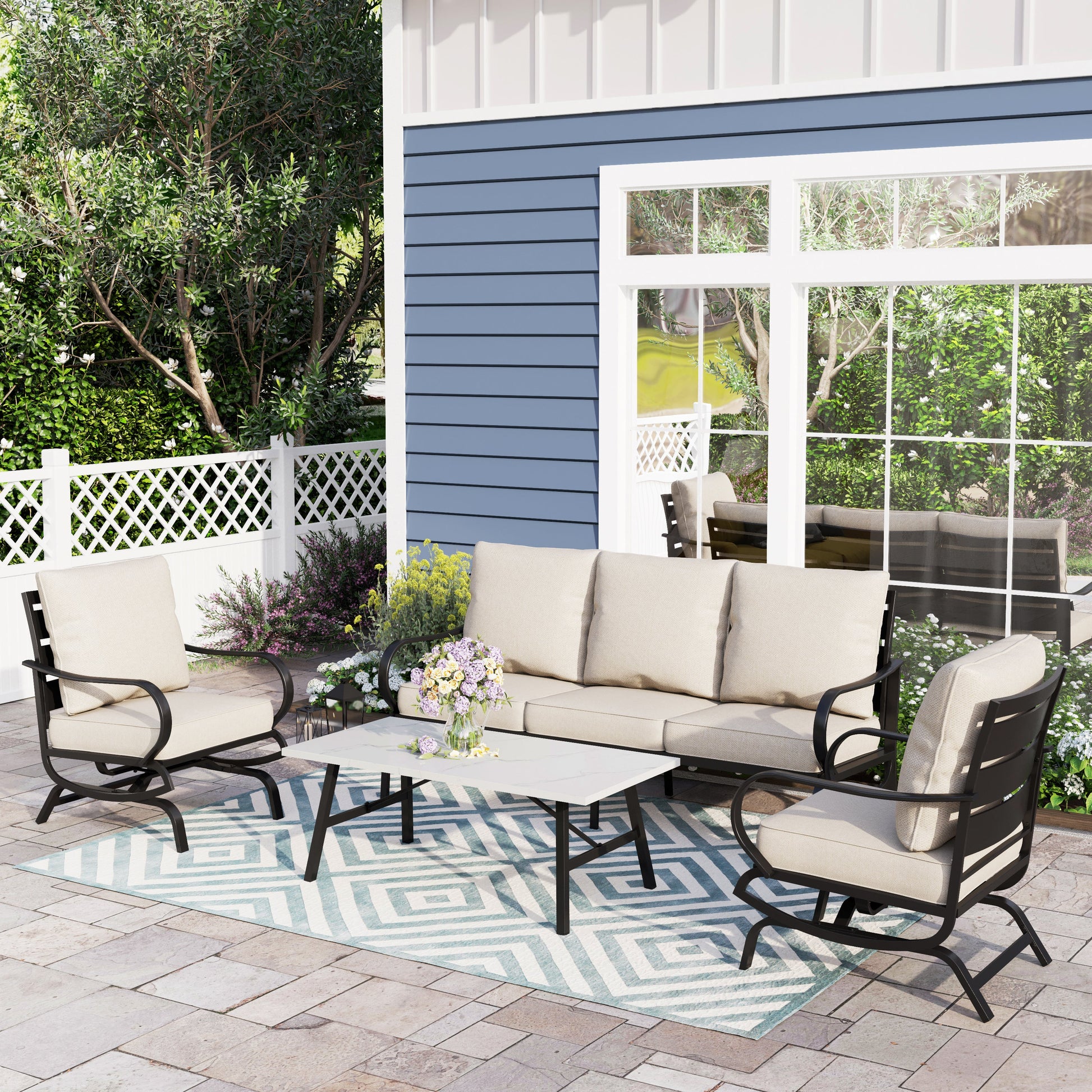 This 4 Pieces Patio Conversation Set is the perfect match for your outdoor Garden, Poolside, Balcony and any other outdoor area. We select steel frame and covered with a coating on the surface, designed to be rust-resistant and long-lasting, to ensure that your conversation set can last for many years. The table's smooth frame and faux-marble surface make for an easy-to-clean table that can be wiped in seconds. Different from the market, our seat cushion uses 28D high resilience sponge and Olefin fabric, oil resistant and fade-resistant. When you sit on it, it will eliminate the fatigue of your day. Smooth 360°swivel chairs are convenient to fetch things or chat with friends without moving the chair,round metal base makes the chair more stable brings you a really comfortable relax time.Moreover, We offer five pillows to make you more comfortable, and reduce your waist damage. Don't hesitate, take this perfect patio conversation set to your family!