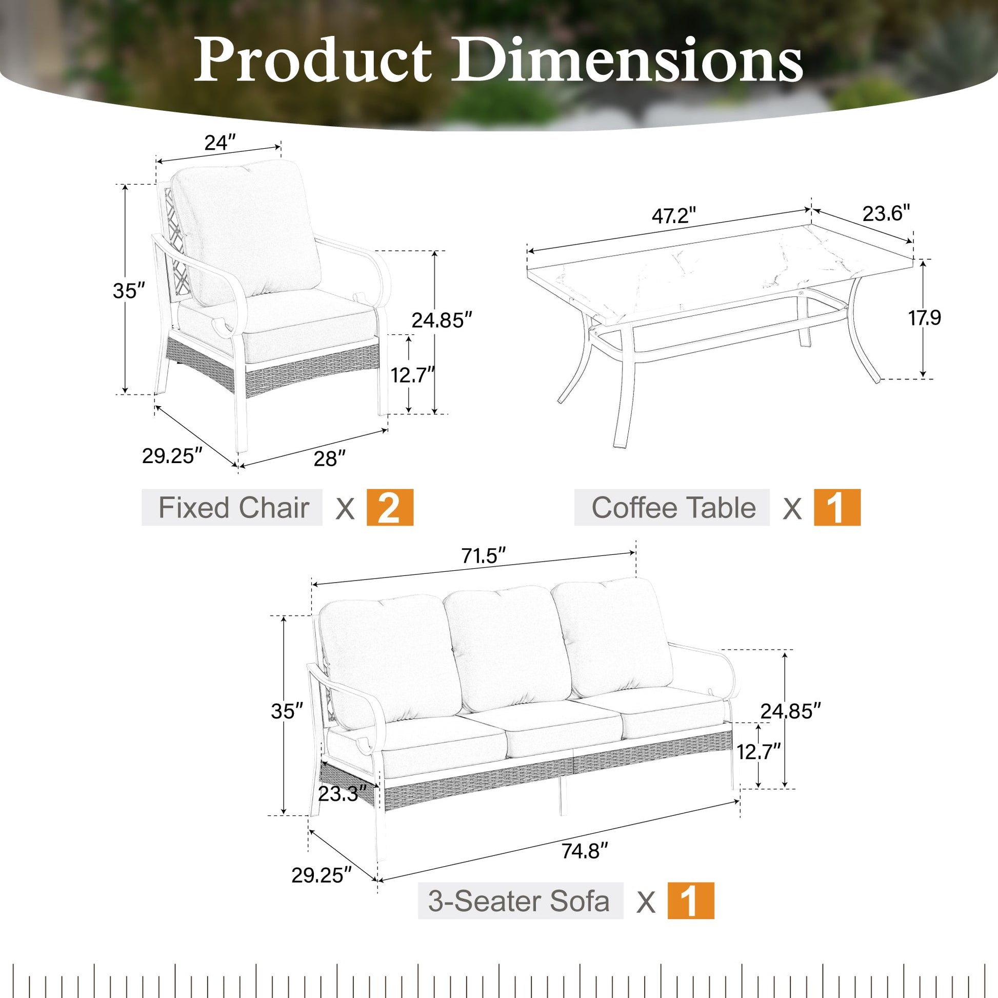 Our Sophia&William Patio Conversation Set is the perfect match for your outdoor Garden, Poolside, Balcony and any other outdoor area. We select steel frame and covered with a coating on the surface, designed to be rust-resistant and long-lasting, to ensure that your conversation set can last for many years. The table's smooth frame and faux-marble surface make for an easy-to-clean table that can be wiped in seconds. Different from the market, our seat cushion uses 28D high resilience sponge and Olefin fabric, oil resistant and fade-resistant. When you sit on it, it will eliminate the fatigue of your day. Don't hesitate, take this perfect patio conversation set to your family!