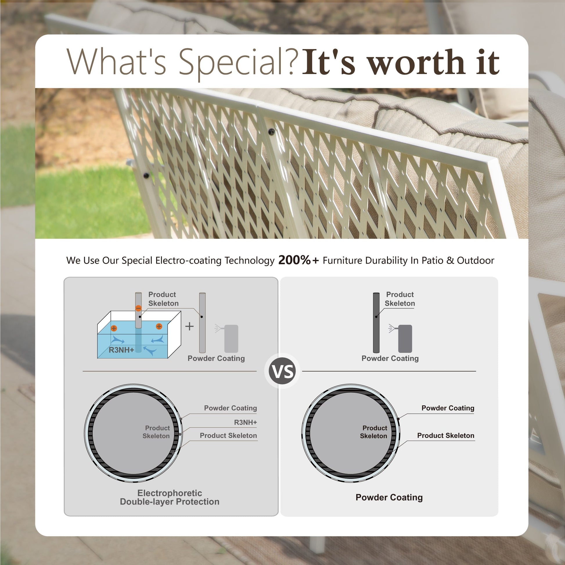 Our Sophia&William Patio Conversation Set is the perfect match for your outdoor Garden, Poolside, Balcony and any other outdoor area. We select white steel frame and covered with a coating on the surface, designed to be rust-resistant and long-lasting, to ensure that your conversation set can last for many years. The table's smooth frame and faux-marble surface make for an easy-to-clean table that can be wiped in seconds. Different from the market, our seat cushion uses 28D high resilience sponge and Olefin fabric, oil resistant and fade-resistant. When you sit on it, it will eliminate the fatigue of your day. Don't hesitate, take this perfect patio conversation set to your family!