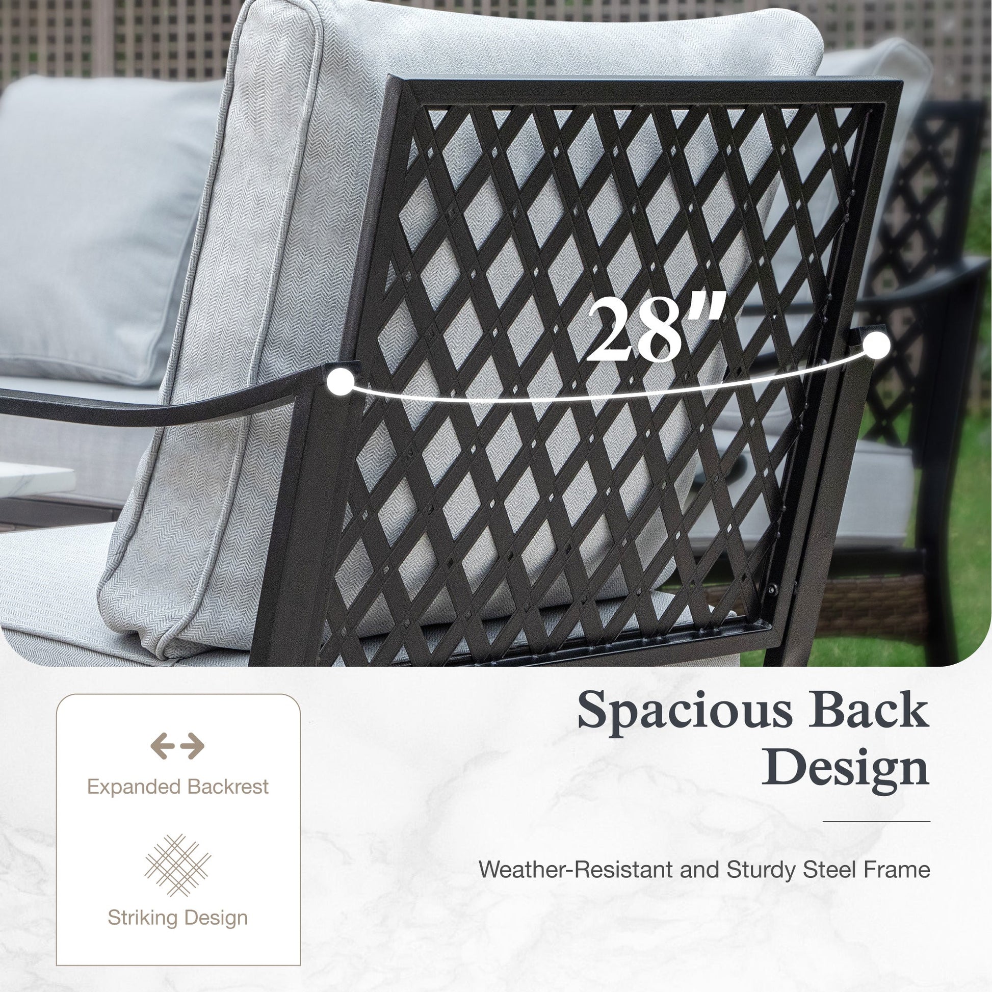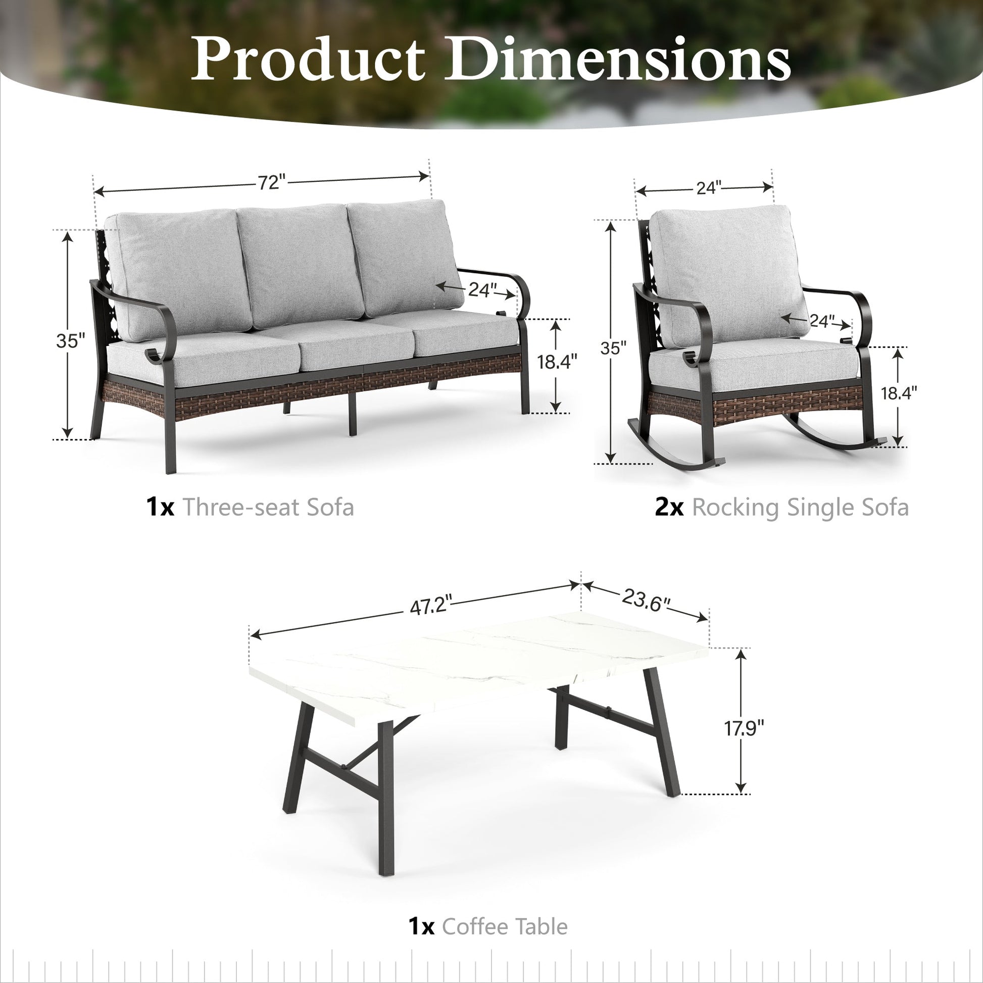This Patio Furniture Set is the perfect match for your outdoor Garden, Poolside, Balcony and any other outdoor area. We select steel frame and covered with powder-coating & e-coating technique on the surface, designed to be rust-resistant and long-lasting, to ensure that your conversation set can last for many years. Different from the market, our seat cushion uses 28D high resilience sponge and Olefin fabric, oil resistant and fade-resistant; 28" extra wide backrest matches your body better. When you sit on it, it will eliminate the fatigue of your day. Rocking Sofa can move back and forth within a range of 10¡ã to 20¡ã, which brings you a really comfortable relax time. Don't hesitate, take this perfect patio conversation set to your family!