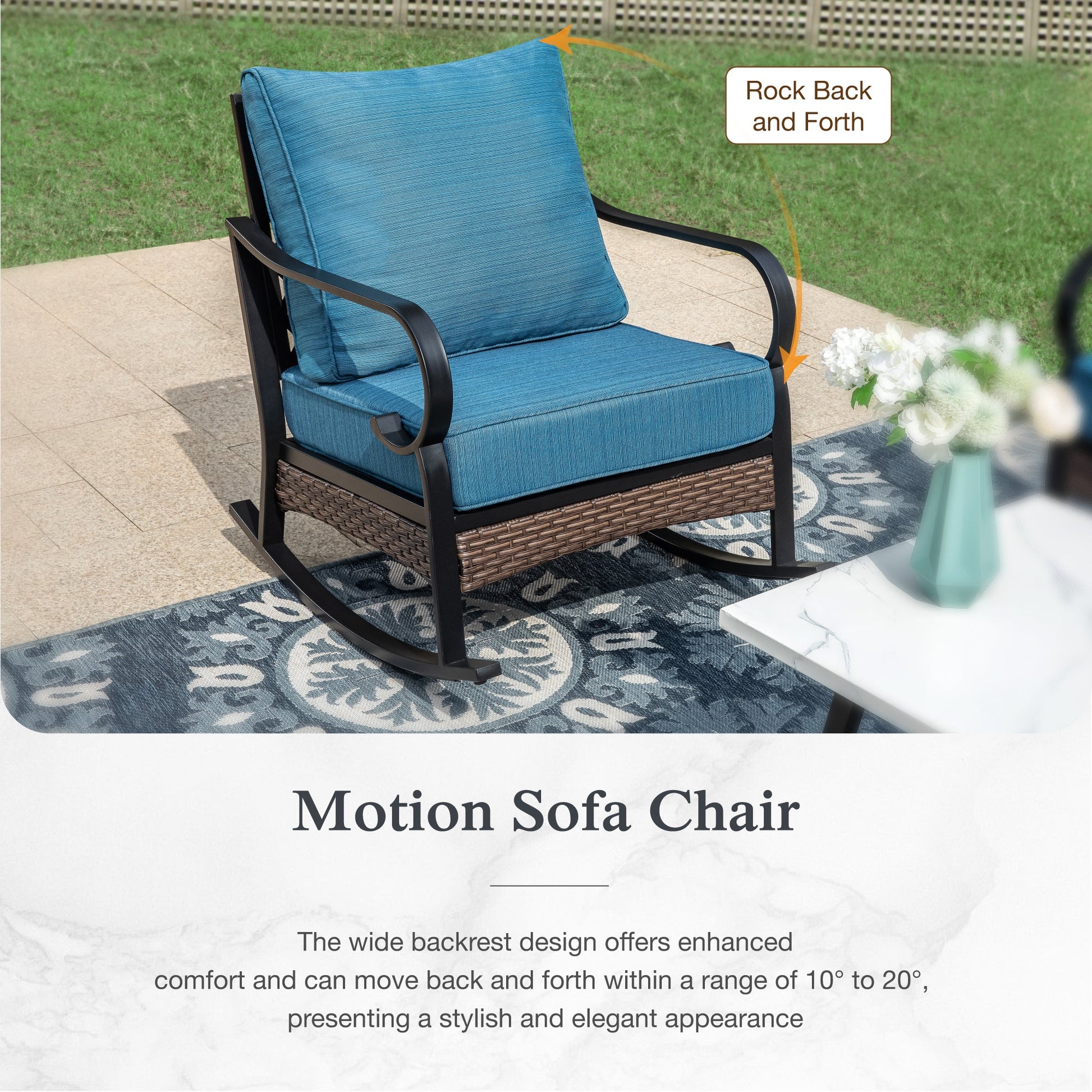 This Patio Furniture Set is the perfect match for your outdoor Garden, Poolside, Balcony and any other outdoor area. We select steel frame and covered with powder-coating & e-coating technique on the surface, designed to be rust-resistant and long-lasting, to ensure that your conversation set can last for many years. Different from the market, our seat cushion uses 28D high resilience sponge and Olefin fabric, oil resistant and fade-resistant; 28" extra wide backrest matches your body better. When you sit on it, it will eliminate the fatigue of your day. Rocking Sofa can move back and forth within a range of 10¡ã to 20¡ã, which brings you a really comfortable relax time. Don't hesitate, take this perfect patio conversation set to your family!