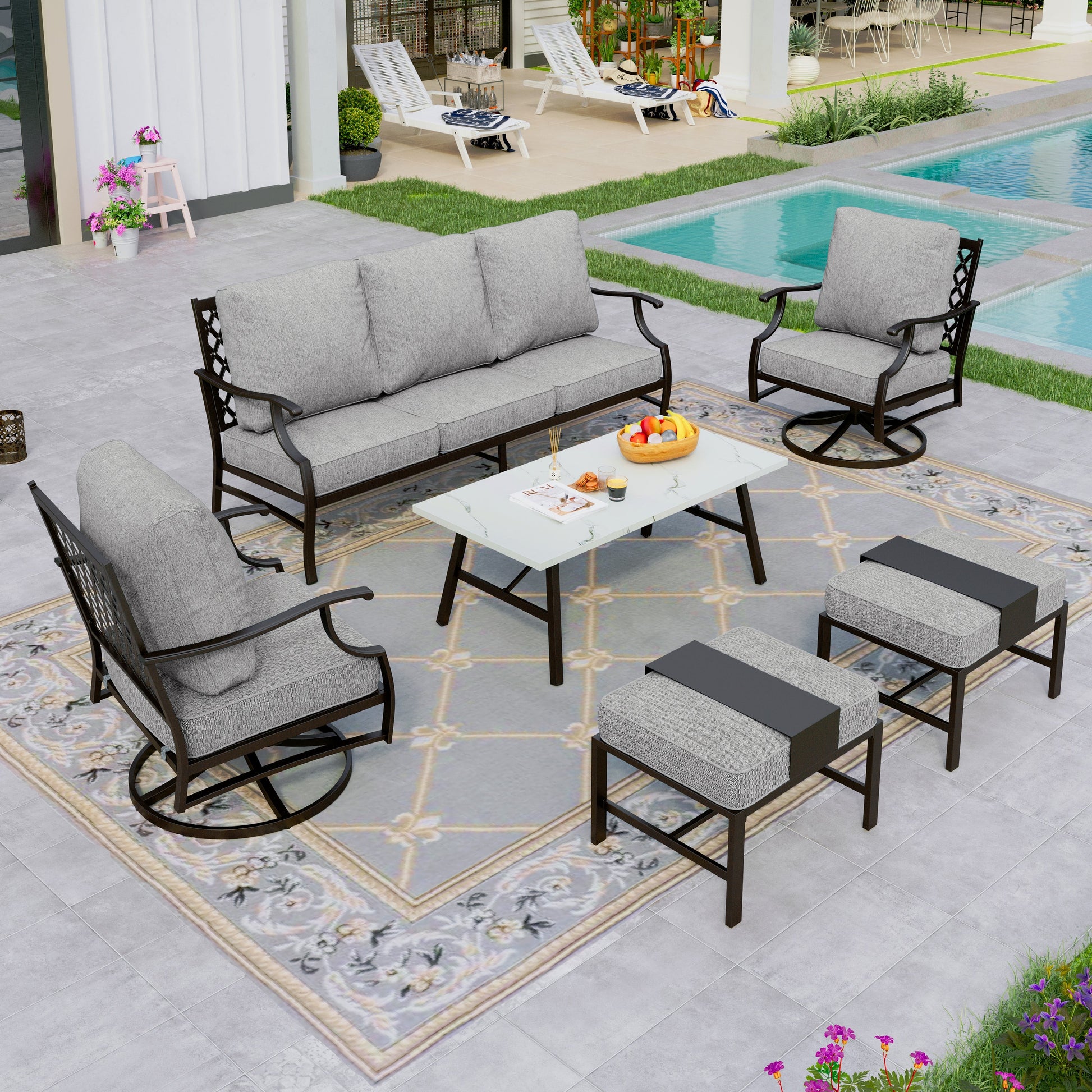 This 6 Pieces Patio Conversation Set is the perfect match for your outdoor Garden, Poolside, Balcony and any other outdoor area. We select steel frame and covered with a coating on the surface, designed to be rust-resistant and long-lasting, to ensure that your conversation set can last for many years. The table's smooth frame and faux-marble surface make for an easy-to-clean table that can be wiped in seconds. Different from the market, our seat cushion uses 28D high resilience sponge and Olefin fabric, oil resistant and fade-resistant. When you sit on it, it will eliminate the fatigue of your day. Smooth 360¡ãswivel chairs are convenient to fetch things or chat with friends without moving the chair,round metal base makes the chair more stable brings you a really comfortable relax time. Functional ottomans with U-shape metal cover meet your different needs. Don't hesitate, take this perfect patio conversation set to your family!