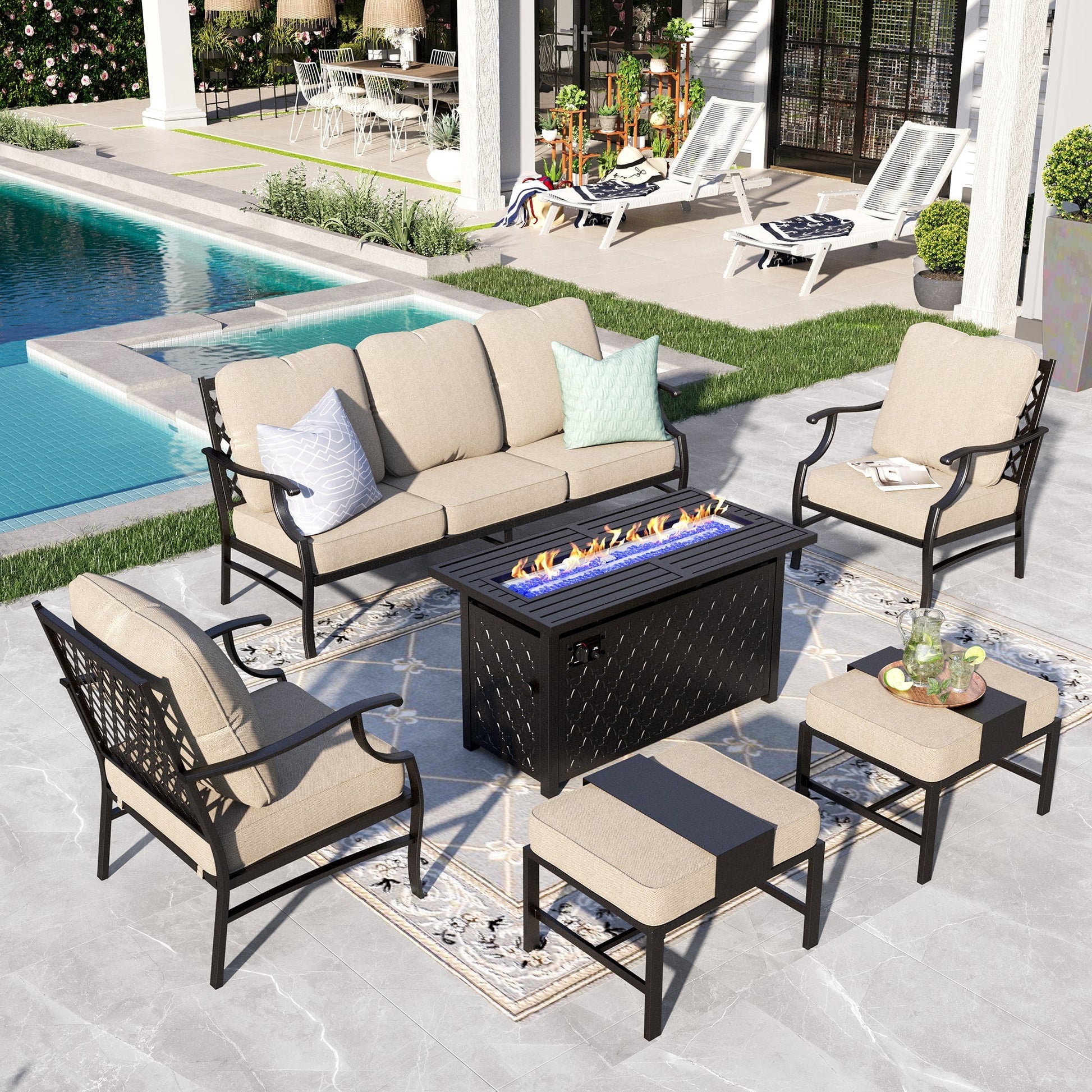 Sophia&William 6 Piece Patio Conversation Set Outdoor Furniture Sofa Set with 50,000BTU Fire Pit Table, Ottomans
