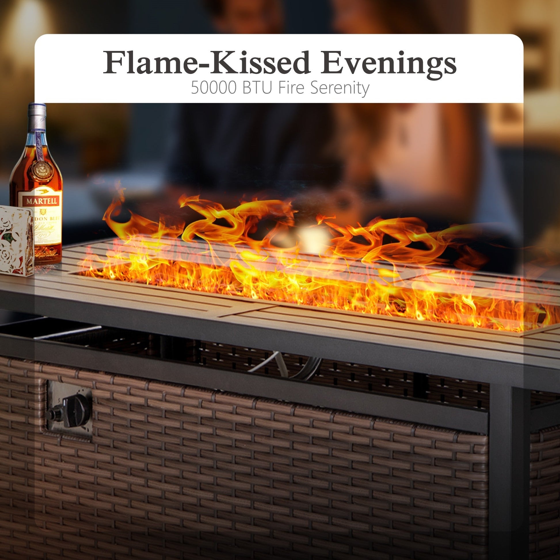 Transform your outdoor space with the Alpha Joy Outdoor Conversation Set! This stylish patio furniture set is crafted from durable resin wicker, ensuring it can withstand the elements for years. The modular design allows you to easily rearrange outdoor sectionals to fit your needs, while the 4-inch thick cushions offer ultimate comfort. Plus, with the unique half-moon shape, you can enjoy a more natural flow of conversation. Don¡¯t forget the eye-catching 56" fire pit table that provides a heating output of 50,000 BTU and doubles as a coffee table or dining space. Create lasting memories outdoors with this beautiful set!