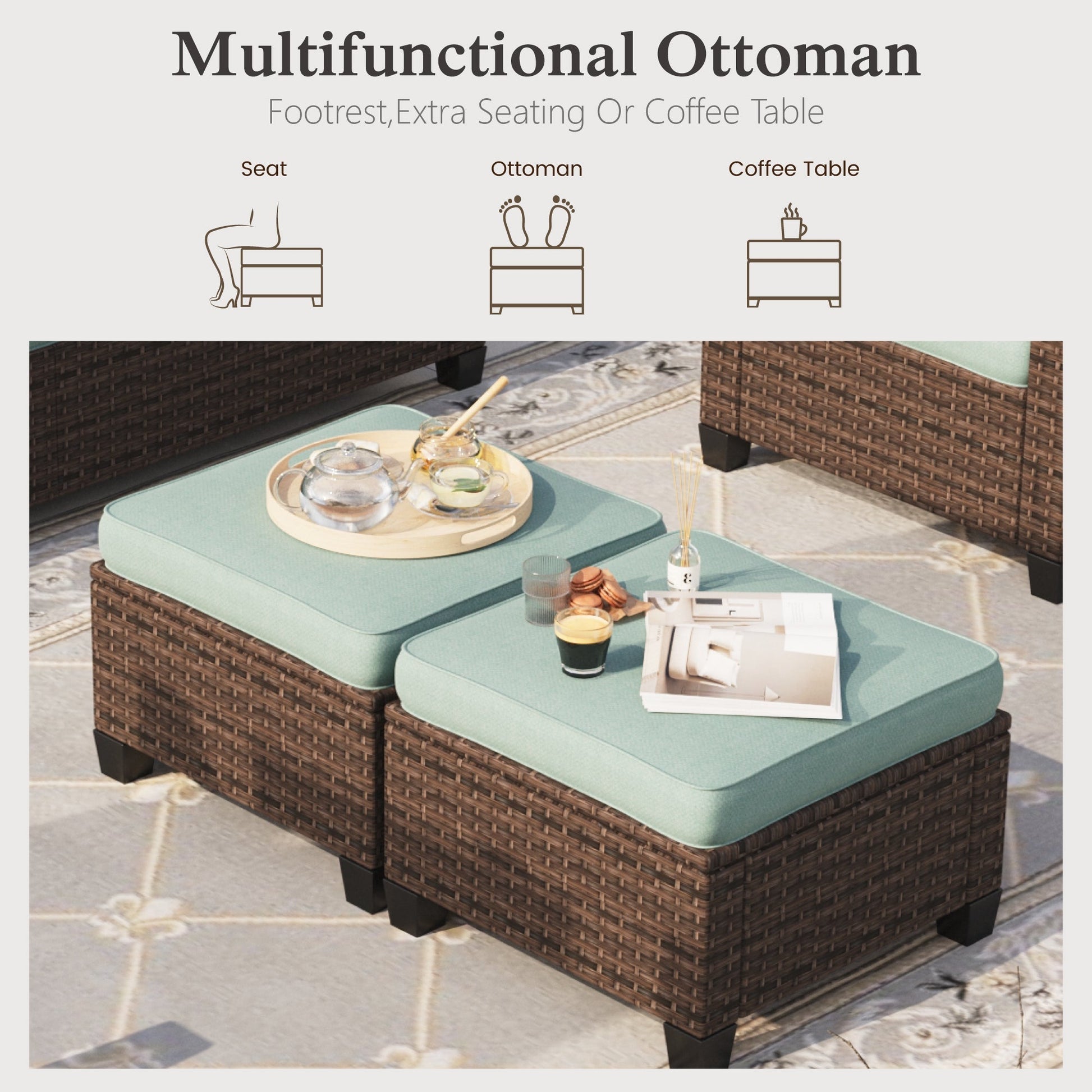Create a cozy outdoor retreat with the 6 Pieces Wicker Patio Furniture Set by Sophia & William. This patio set includes a spacious 3-seat sofa with 2 pillows, 2 swivel chairs, loveseat and 2 versatile ottomans, comfortably seating up to 9 people. The swivel chairs rotate 360¡ã and gently rock for added relaxation. The ottomans serve multiple purposes as additional seating, footrests, or side tables. Crafted from reinforced rattan, this lanai furniture is built to last and withstand all weather conditions. Enjoy the plush sofa cushions with a patented, water-repellent, and stain-resistant cover that is easy to maintain and clean thanks to its convenient zipper. Ergonomically designed for comfort, each seat has a supportive backrest and wide armrests. Perfect for your patio, balcony, poolside or porch, this sofa set will be the highlight of your outdoor conversation space!