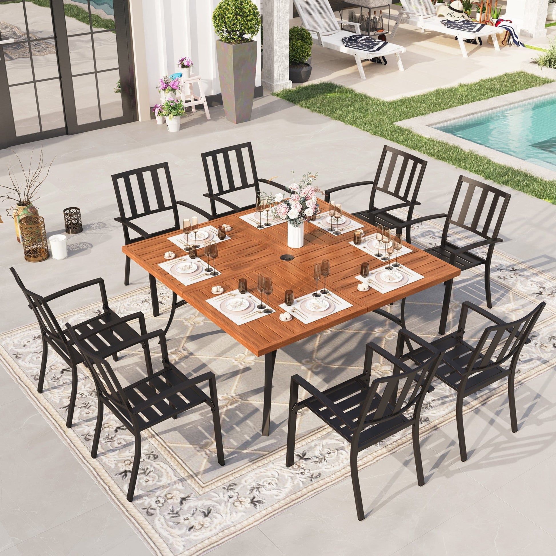 Our Sophia & William outdoor dining set makes your outdoor space fancy and fresh. This dining set includes 8 fixed chairs and 1 60" square table with umbrella hole. Combined with functional and transitional design, polished by E-coating finish and hand-printed teak grain, making this set incredibly durable and easy to maintain. The fixed chairs are wide and sturdy, which offer you a comfortable seating experience. This modern furniture set is definitely worth your choice.