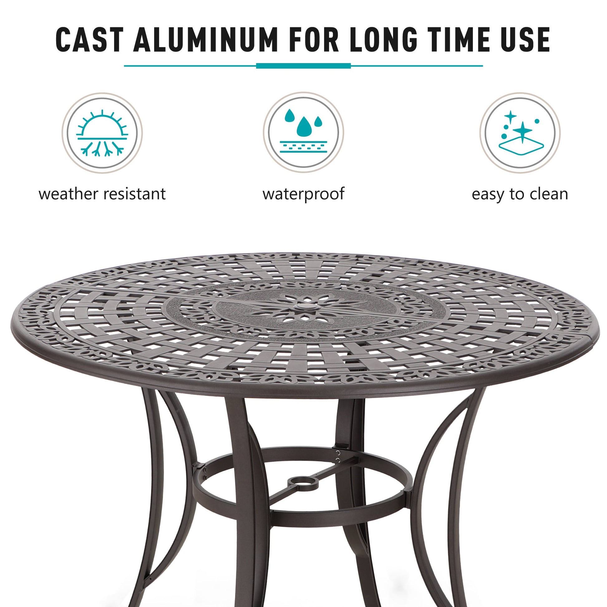 If you're looking for some patio high bar set to enjoy your leisure time with your family, this set might just be the one for you. The patio high bar table is made of cast aluminum, which is resistant to weather, fade and rust. It can be used for outdoor leisure time for a long time. High bar chairs are constructed with the rust-resistant cast aluminum which makes it all-weather proof and last for many years. Springy sponge cushion is super comfortable and soft. Waterproof fabric make it ideal for the outdoor living space. Smooth 360 degrees rotation for easy turn around on your seat, so you can move your waist and legs when have a long time seating. High back patio dining chairs provide great support for your neck and back, and the high-density cushions provides much softness. Equipped with high bar table. Built with umbrella hole in the center of the table to add a patio umbrella for shade. You'll surely enjoy this with your family in any time.