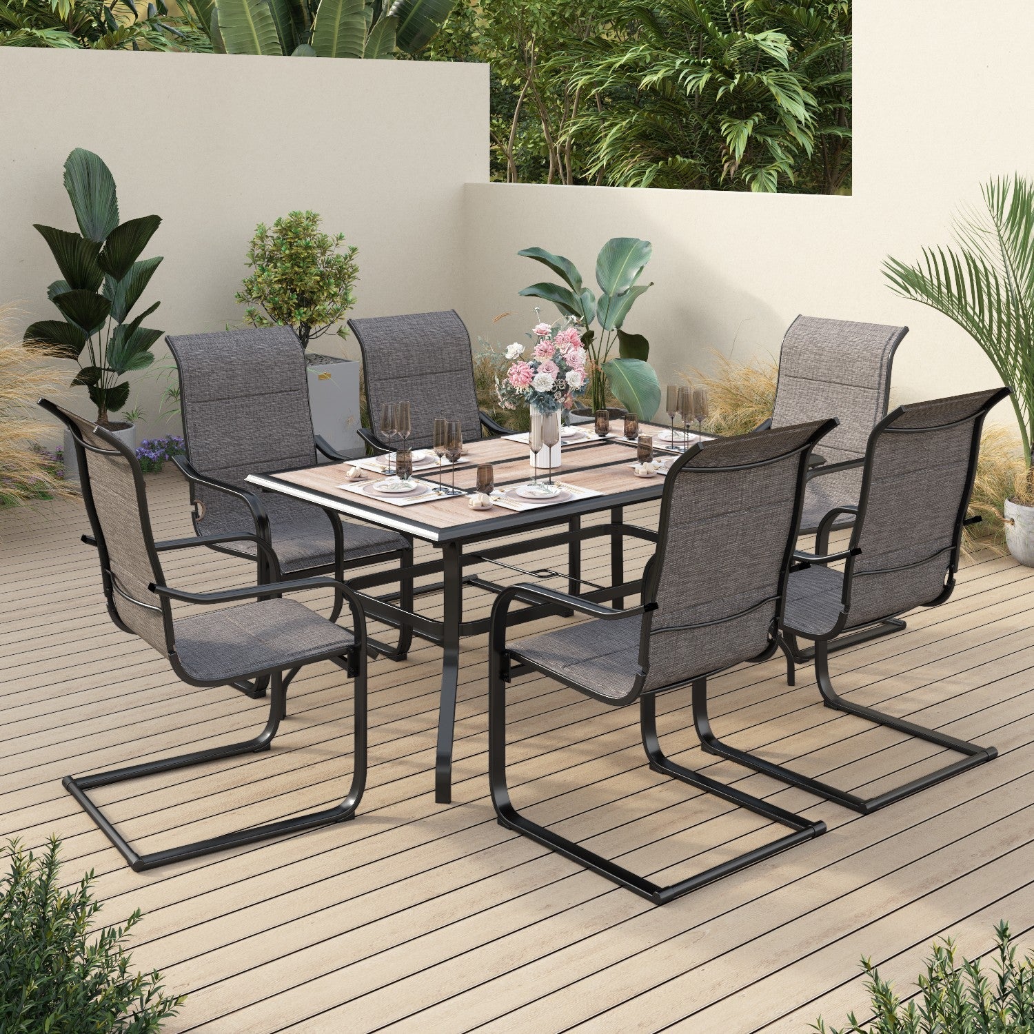 - Table: rust and weather resistant metal steel frame and PVC wood like tabletop