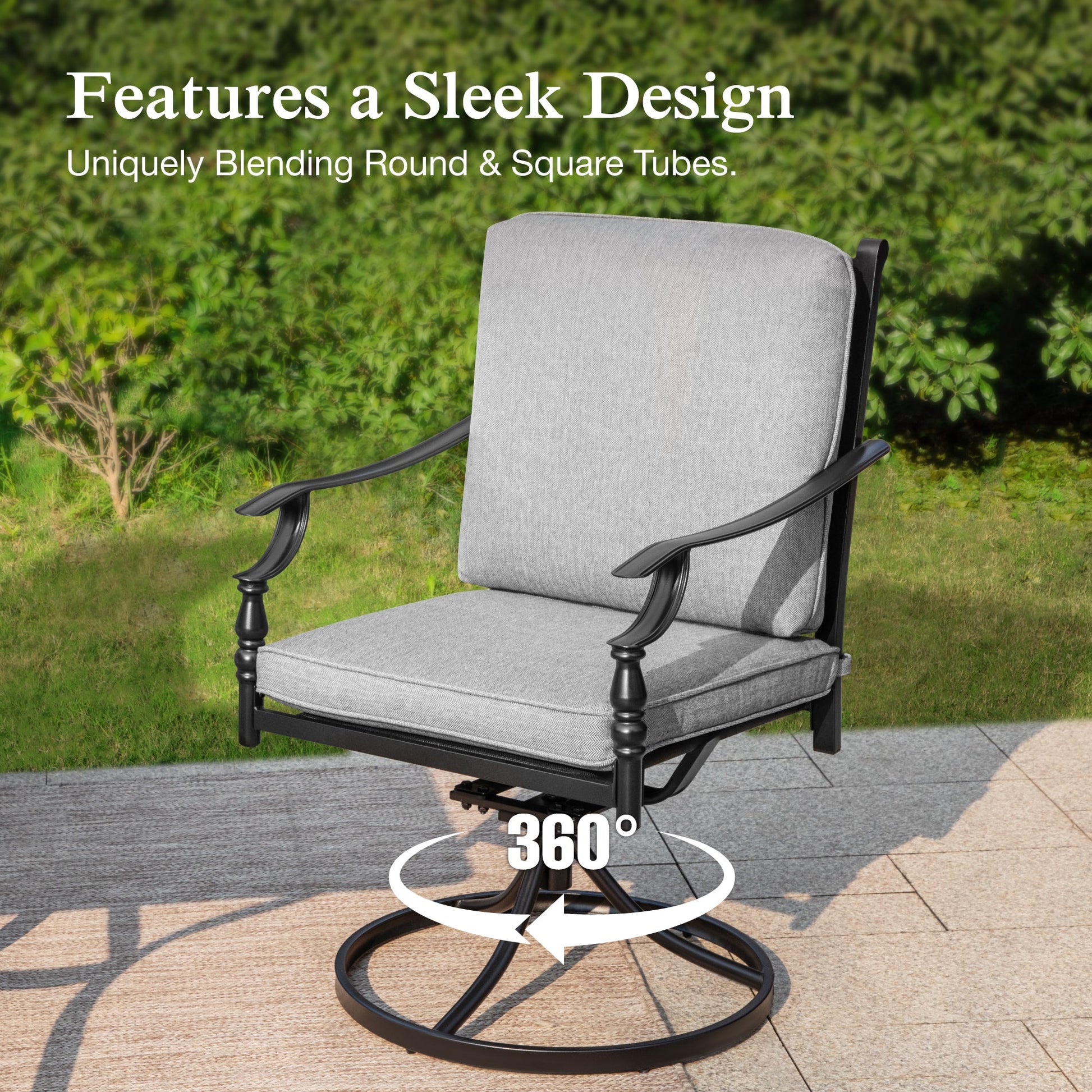 This 7-piece patio set includes 1 dining table, 4 swivel patio chairs, and 2 leg chairs, making it the perfect addition to your outdoor deck, backyard, balcony, garden, or poolside. Crafted from high-quality metal, the set features an anti-rust and weather-resistant electronic coating for enhanced durability and longevity, while requiring minimal maintenance for easy cleaning. With its sleek armrests and simple yet elegant back design, this set effortlessly complements a variety of outdoor settings.