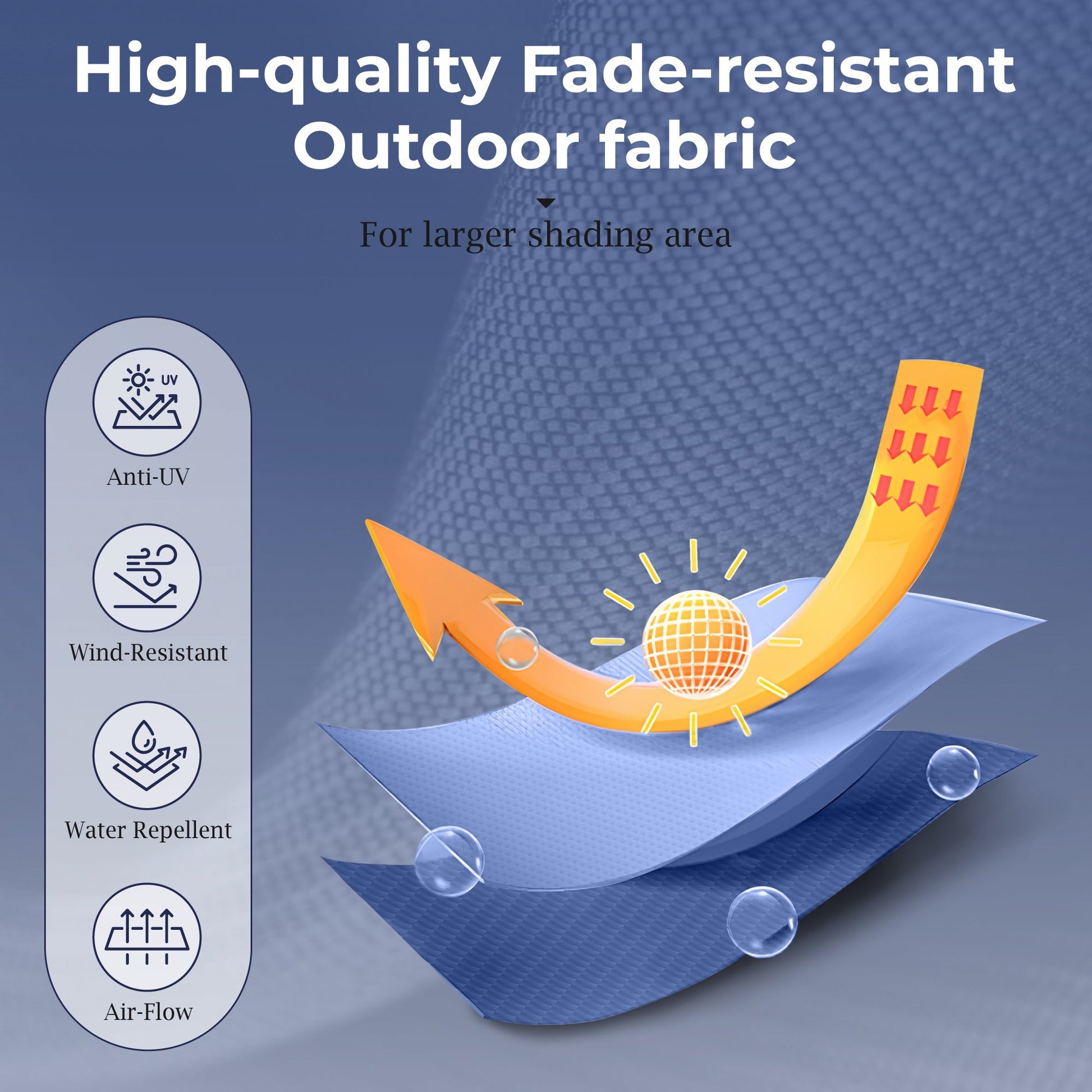 ¡¾Premium Polyester Fabric¡¿The canopy is made of high-quality 100% polyester fabric that not only provides excellent UV protection but is also durable and weather-resistant. Its fade-resistant material ensures that your umbrella will maintain its vibrant color over time.