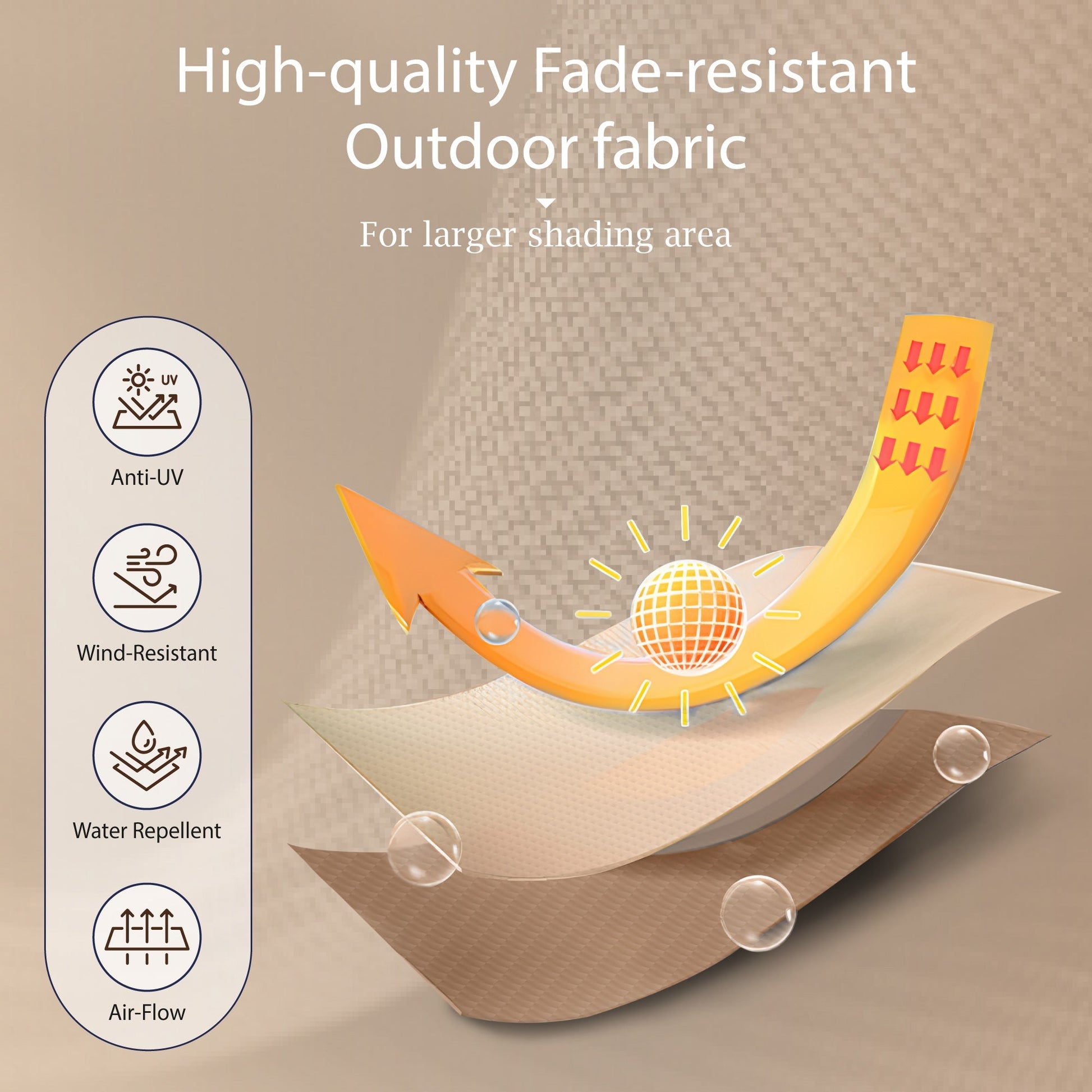 ¡¾Premium Polyester Fabric¡¿The canopy is made of high-quality 100% polyester fabric that not only provides excellent UV protection but is also durable and weather-resistant. Its fade-resistant material ensures that your umbrella will maintain its vibrant color over time.