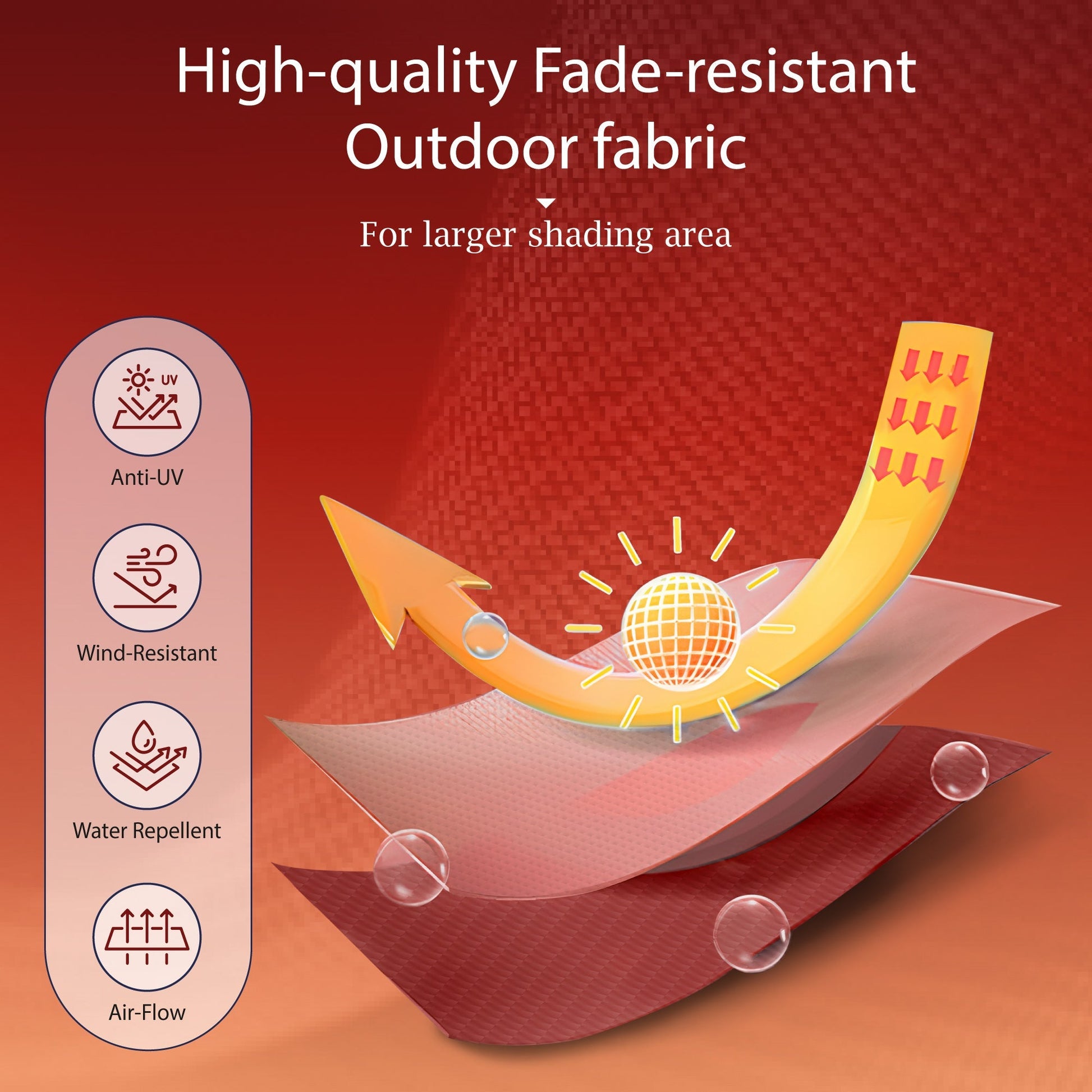 ¡¾Premium Polyester Fabric¡¿The canopy is made of high-quality 100% polyester fabric that not only provides excellent UV protection but is also durable and weather-resistant. Its fade-resistant material ensures that your umbrella will maintain its vibrant color over time.