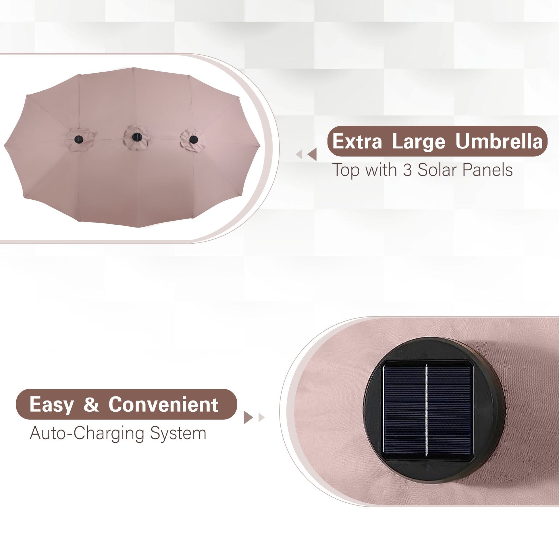 Transform your outdoor space with our extra large market umbrella. This Sophia & William 15FT patio umbrella is perfect for outdoor gatherings and entertaining guests, with its durable rust-resistant steel pole and ribs that provide extra stability. It is built to last, with a high-quality 100% polyester canopy that is UV-resistant, water-repellent, and resists fading and mildew. With the auto-charging solar panel and LED lights, you can enjoy your outdoor space even after the sun goes down. So why wait? Order our umbrella today and start enjoying your outdoor space in comfort and style!