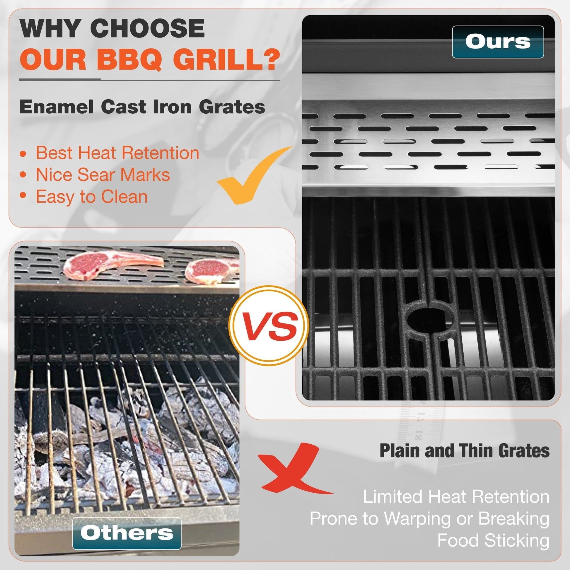 - Porcelain-enameled iron cooking grates and stainless steel warm plate