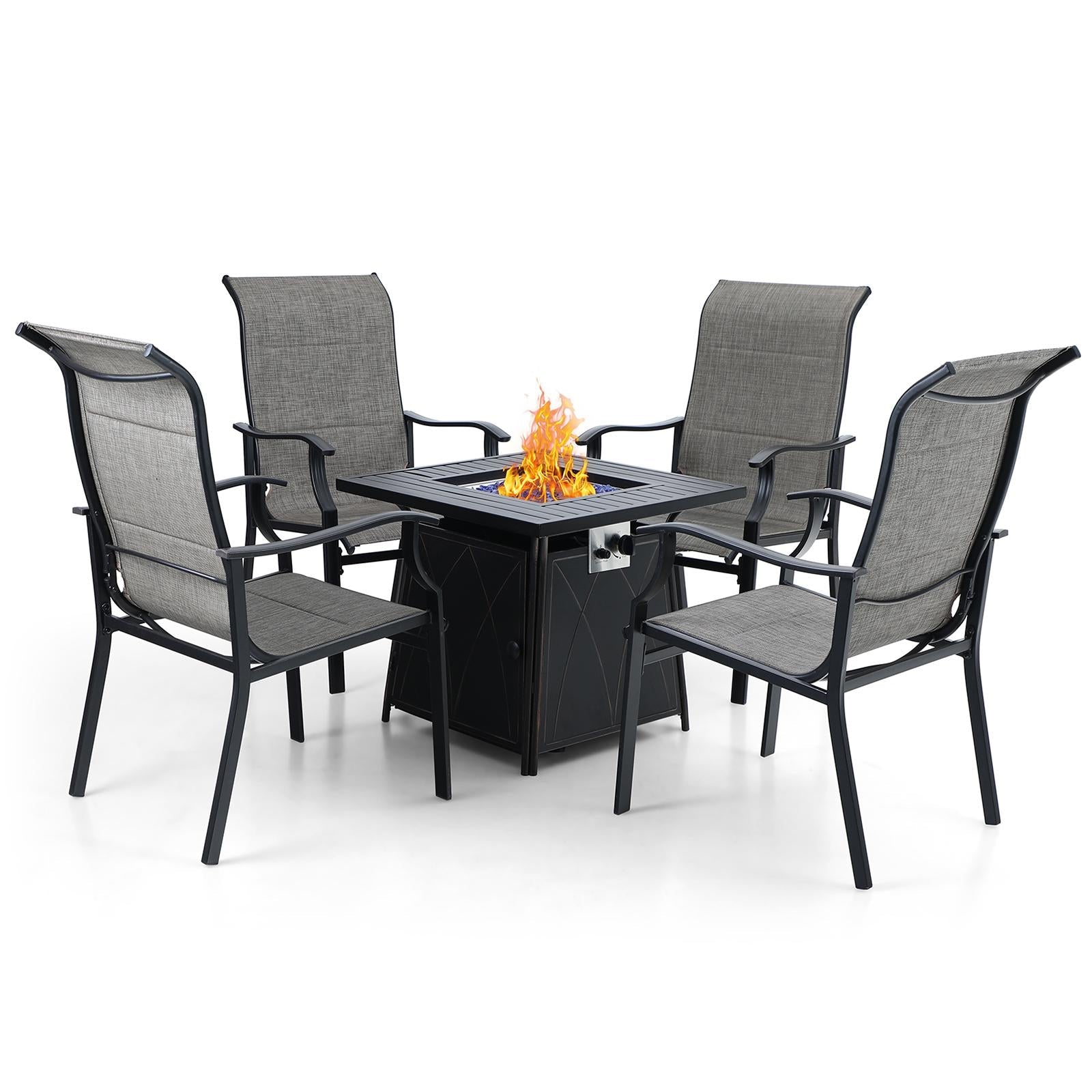 This patio set consists of 4pcs metal chairs and 1pc fire pit table, provides the warmth and ambiance of a classic fire. It fits our lifestyle so much better than having to take the time to build a fire from scratch, gathering/buying/storing wood. Our gas fire pit table is 50,000 BTU heat output and provides stable and clean combustion without any ash. This 28" large square fire pit table uses propane gas to ensure stable and environment-friendly, at the same time it will provide you a safety warm atmosphere compare with the traditional heating equipment. Sitting around a fire pit in the nights, gazing at it, enjoying the company of friends and guests is something that everyone would love to do.