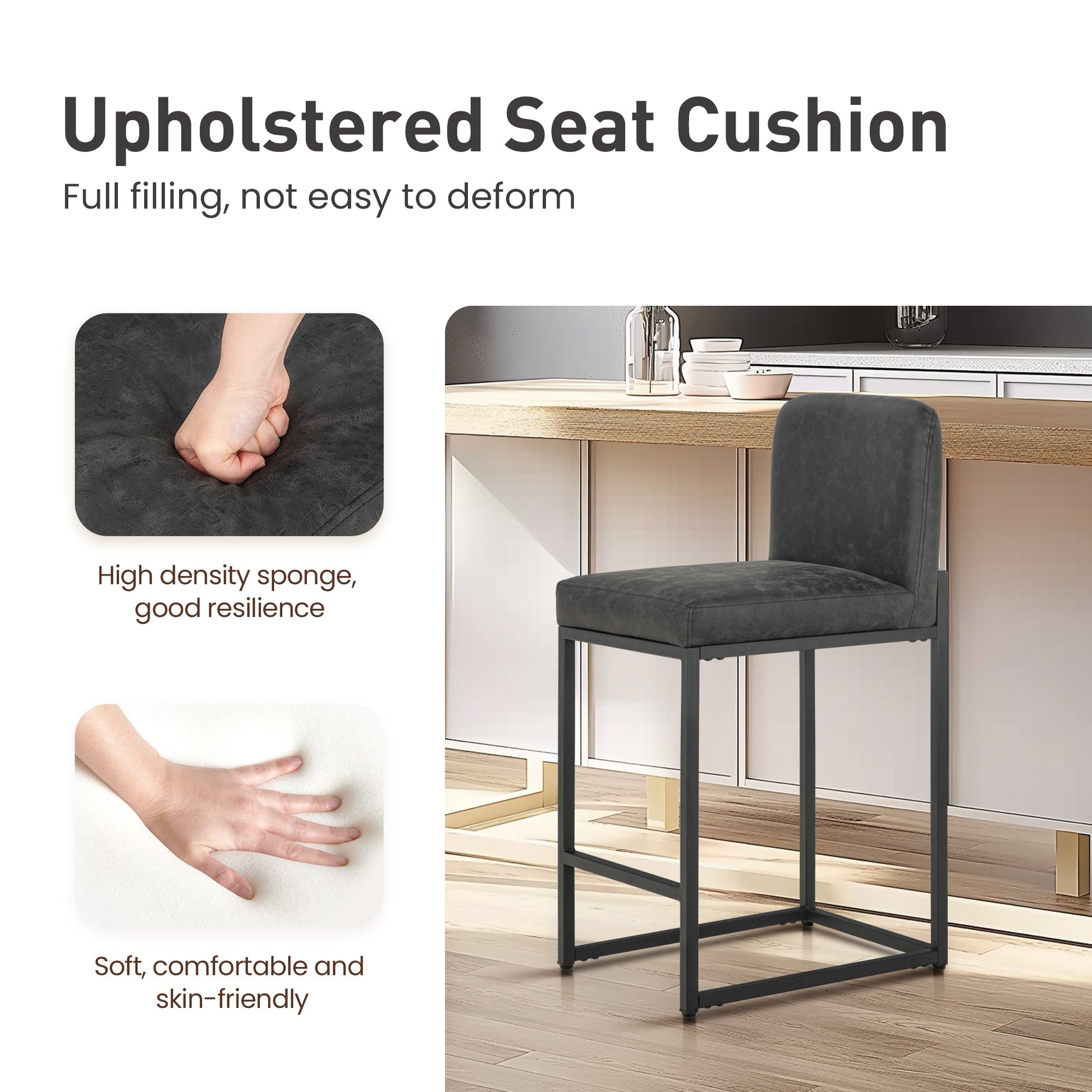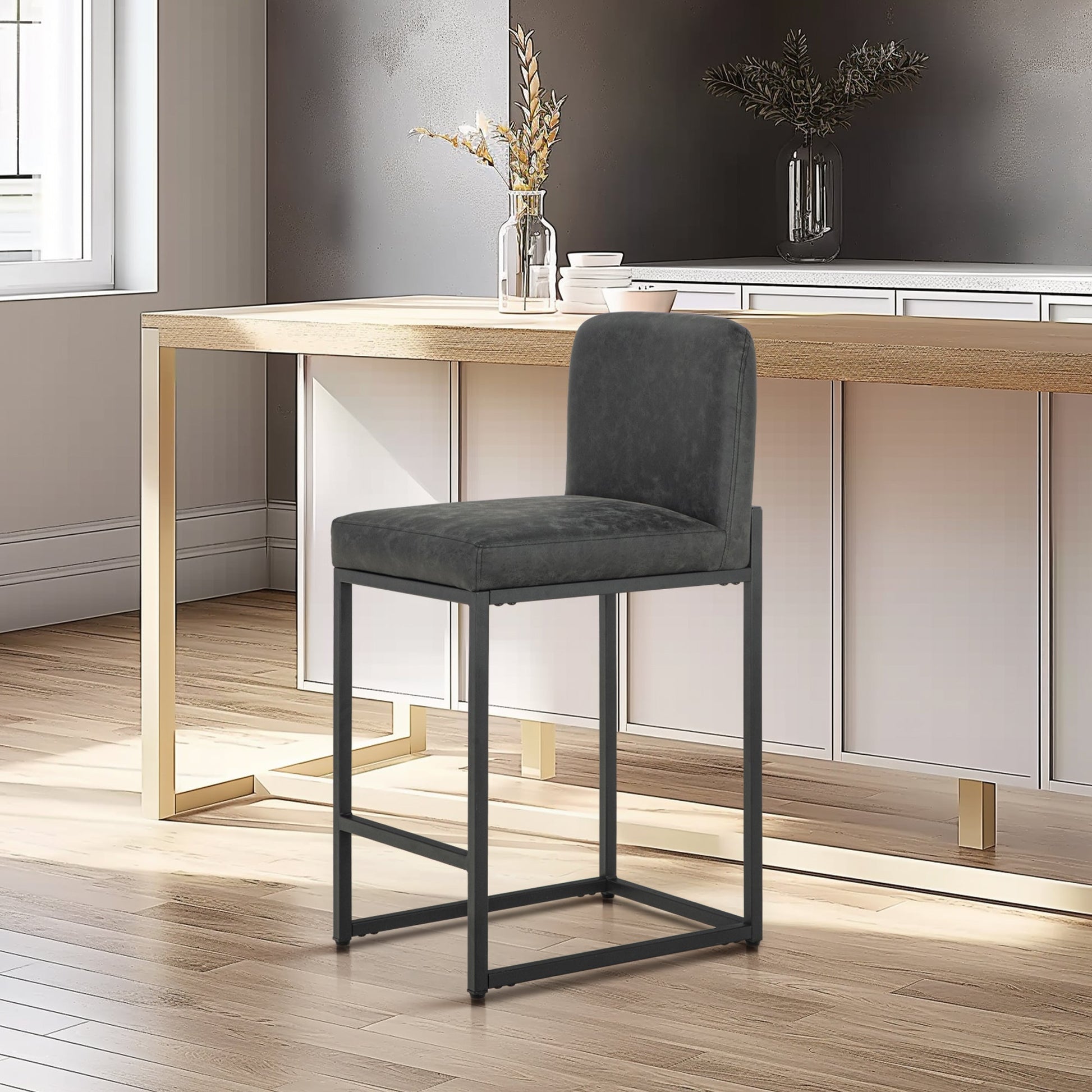 Revitalize your kitchen, bar, or workspace with these ultra-sturdy counter-height stools, expertly crafted for durability and everyday comfort. Built with a matte black powder-coated steel frame and an extended metal base, they deliver unmatched stability for busy restaurants, bustling kitchens, or lively home gatherings. The easy-clean faux leather upholstery wraps a high-density sponge cushion that retains its shape for years, while the skin-friendly surface and ergonomic design ensure all-day comfort. From 34" breakfast bars to 88" pub tables, these stools blend industrial strength with sleek modern style.