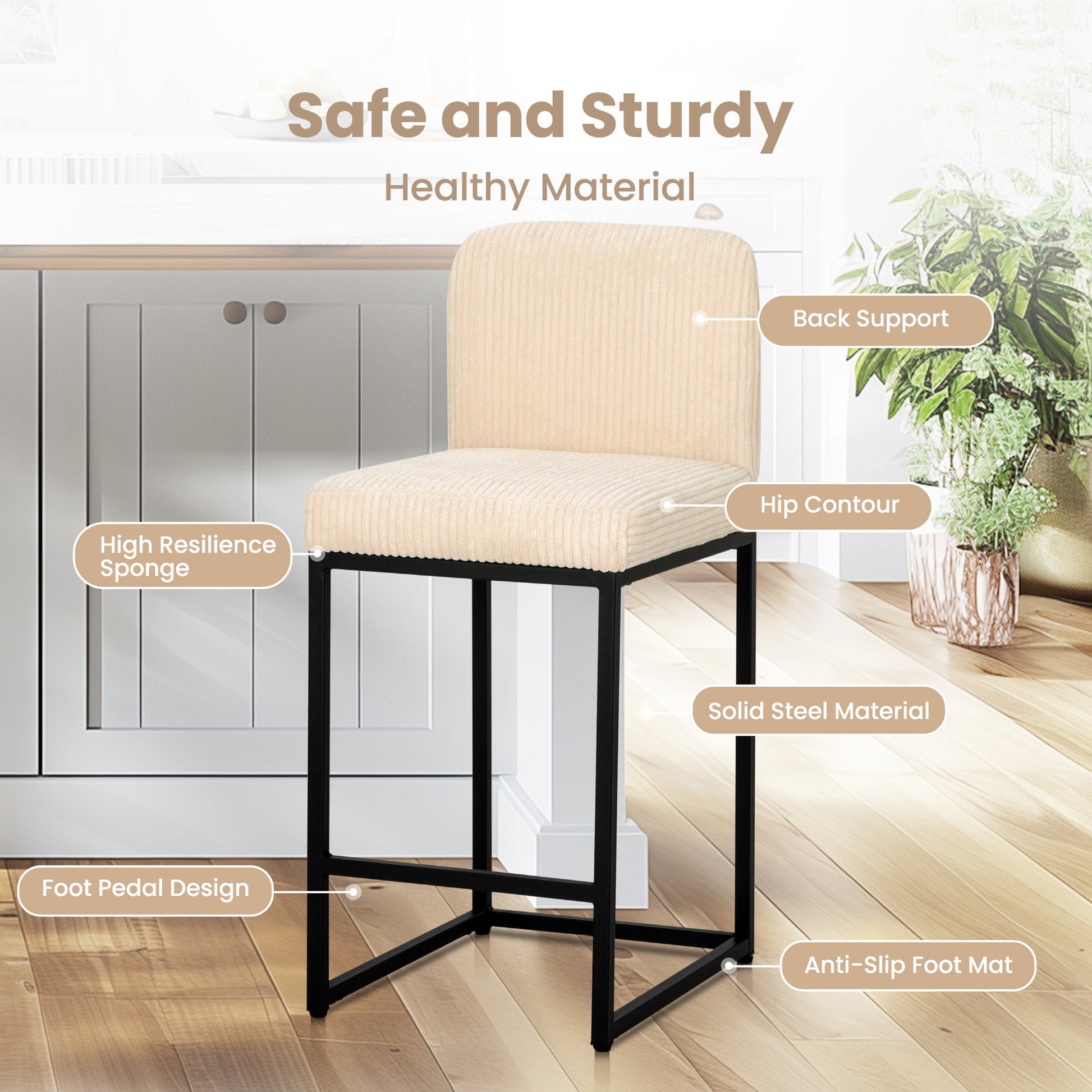 Elevate your kitchen, bar, or workspace with these durable counter-height stools, combining industrial-grade steel strength with retro-inspired comfort. Crafted with a matte black powder-coated frame and extended stabilizer base, they thrive in bustling cafes, lively homes, or busy workshops. The soft corduroy fabric seat wraps a high-density foam core that resists sagging, while ergonomic curves and reinforced joints ensure all-day comfort and 330lbs weight capacity. Perfect for 34"–88" tables, these stools blend rugged reliability with timeless style.