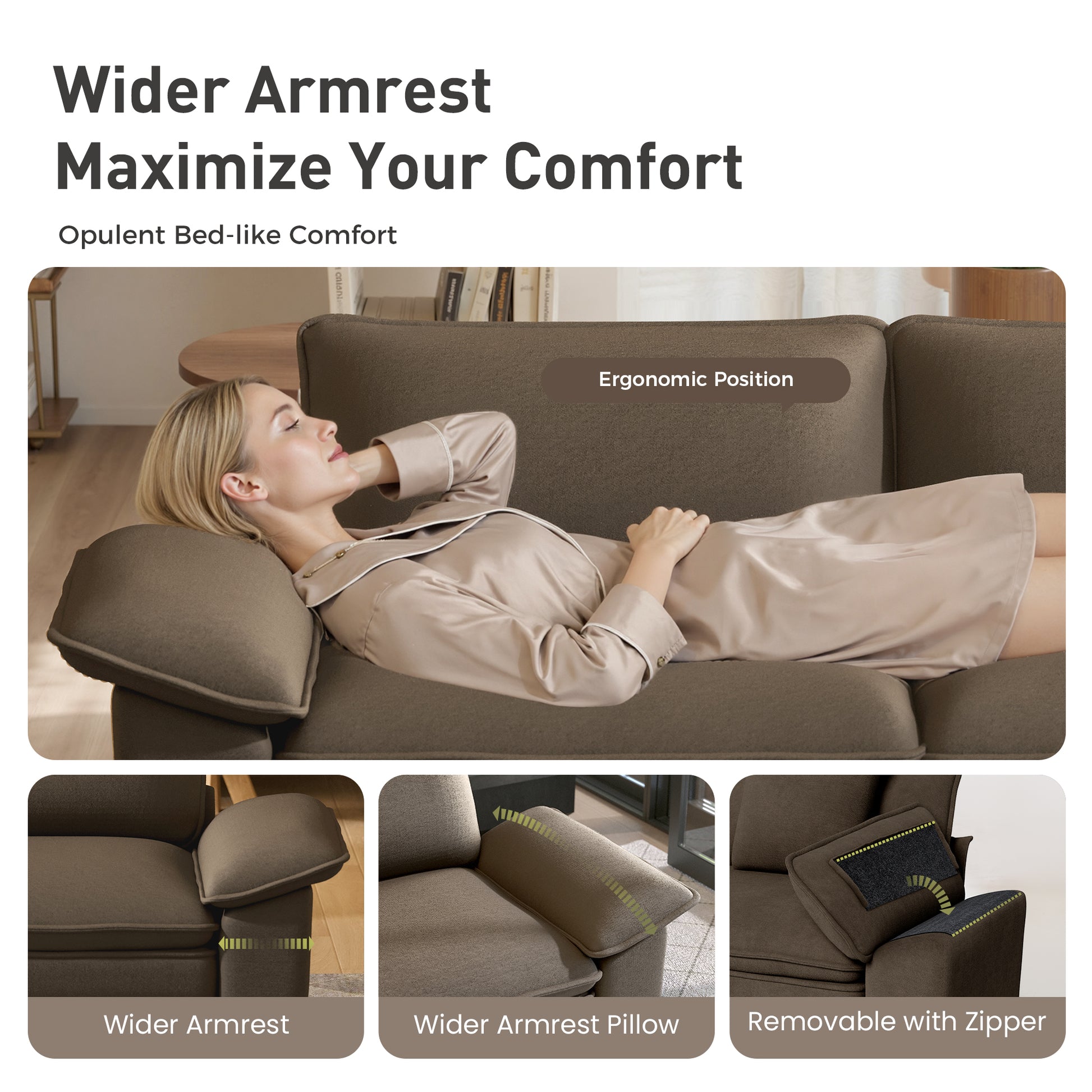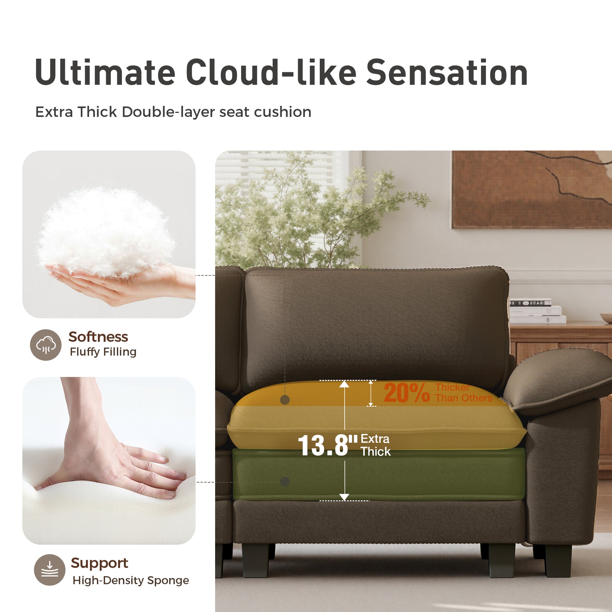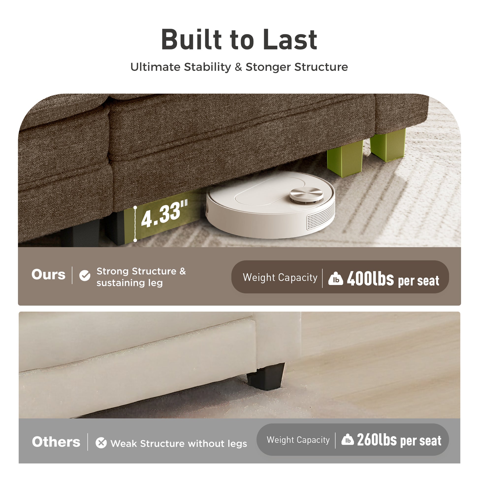 Versatile Style, Limitless Configurations: This sectional sofa set effortlessly complements any d¨¦cor from modern to Scandinavian to industrial. Mix and match the modular pieces to create your perfect layout ¨C whether it's L-shape, U-shape, sectional, or straight, the choice is yours! Cloud-Like Comfort: Experience ultimate relaxation with our 13.8" double-layer seat cushion and high-density support foam, featuring fluffy filling. Enjoy a weightless feel that remains supportive over time. Each seat comes with a matching pillow and 13" wider armrests, ensuring extra comfort for lounging. Solid Wood Frame: Built to last, our durable frame resists deformation and supports up to 400 lbs per seat, ensuring this living room furniture set stays steady and wobble-free for years. High-Density Sponge Core: Designed to retain its shape even after years of use, this cloud couch is crafted for long-lasting comfort. Ergonomic Back Support: The contoured wood back is designed with an inclined curvature that cradles your spine, while the added throw pillows ensure lasting comfort throughout the day. Hightened Feet Design: Our strong legs have been upgraded to 4.33 inches, providing a higher seat height compared to the old version and other sofas. Effortless cleaning is achieved with abundant storage space, making it easy to keep your home tidy, available in both robot vacuum and traditional vacuum cleaner options. Perfect For: Living Rooms | Home Theaters | Office Lounges | Studio Apartments