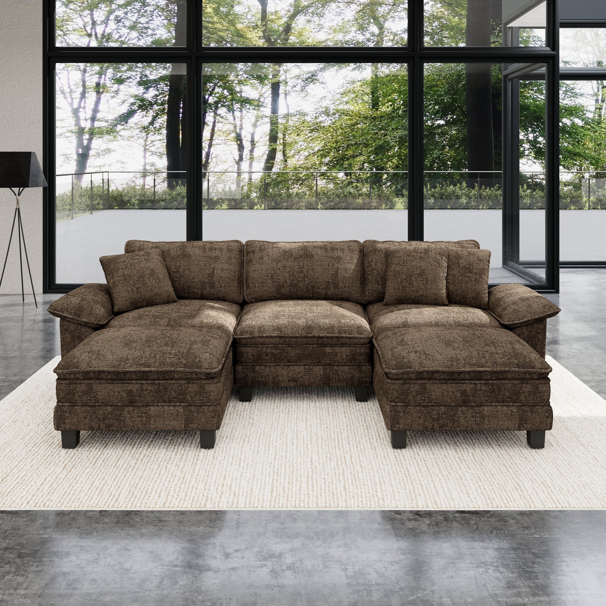 Sophia&William 123.6"L Convertible Chenille Sectional Sofa Couch, Modern 5-Seat Deep Sofa Modular with 3 Pillows & 2 Ottomans, Pillows for Living Room,Brown