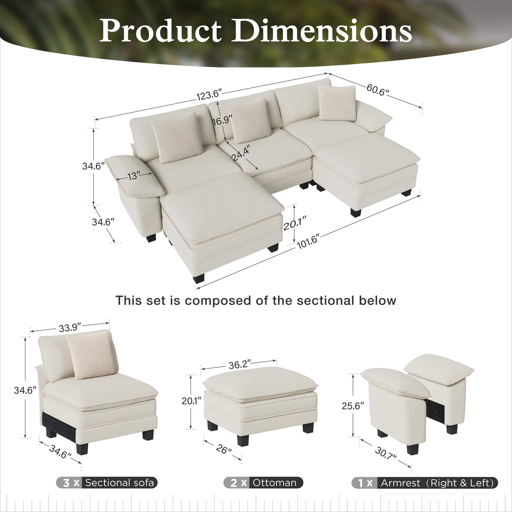 - Pattern: 3 x Sectional Sofa+2 x Ottoman+1 x Armrest (Right & Left)