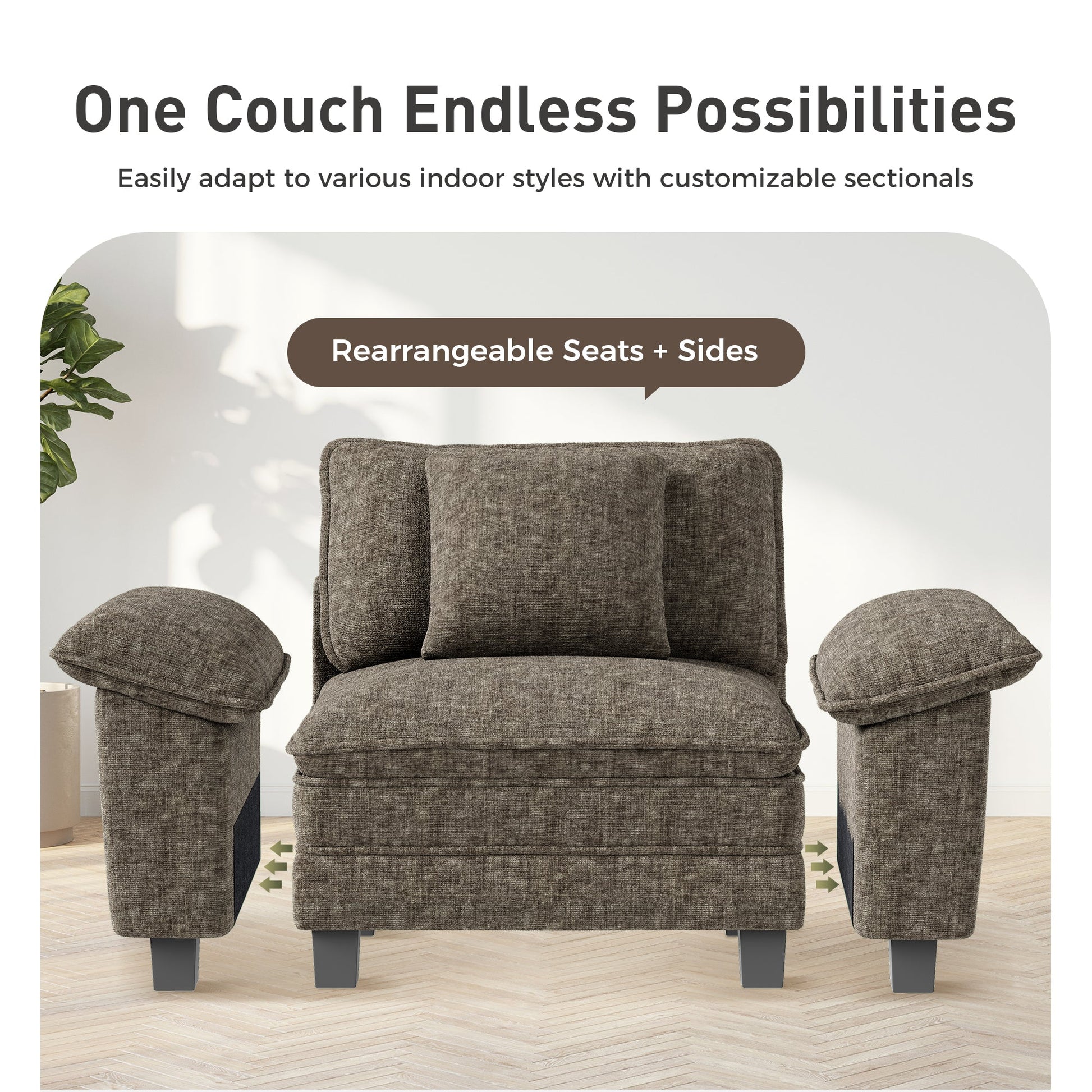 Versatile Style, Limitless Configurations: This sofa effortlessly complements any d¨¦cor from modern to Scandinavian to industrial. Mix and match the modular pieces to create your perfect layout ¨C whether it's L-shape, U-shape, sectional, or straight, the choice is yours! Cloud-Like Comfort: Experience ultimate relaxation with our 13.79" high-density support foam and soft, fluffy filling. Enjoy a weightless feel that remains supportive over time. Ergonomic armrests and detachable back pillows provide extra comfort for lounging. Solid Frame: Built to last, our durable frame resists deformation and supports up to 1,200 lbs, ensuring it stays steady and wobble-free for years. High-Density Sponge Core: Designed to retain its shape even after years of use, this sofa is crafted for long-lasting comfort. Wood Back Support Design: The contoured wood back support cradles your spine, providing lasting comfort throughout the day. Removable, Washable Covers: Cleaning is a breeze with our optional removable covers, making it easy to refresh your space with a quick style update. Anti-Scratch Metal Legs: Our stylish metal legs not only protect your floors but also add a touch of modern elegance. Perfect For: Living Rooms | Home Theaters | Office Lounges | Studio Apartments