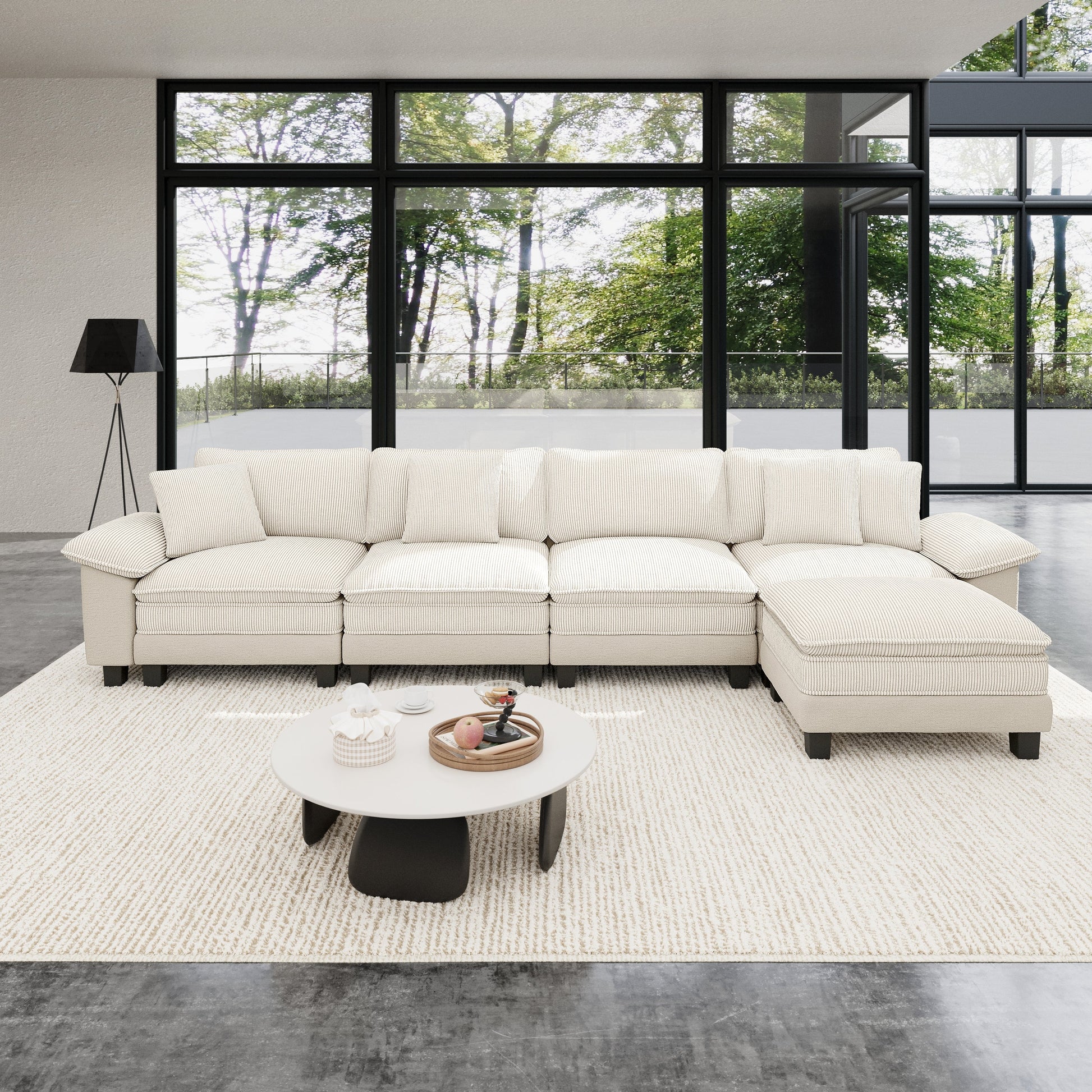 Sophia&William 157.5"L Modular Sectional Sofa Couch, Modern Chenille Couch 5-Seat in Corduroy Frame Sofa with 4 Pillows & Ottoman for Living Room,White