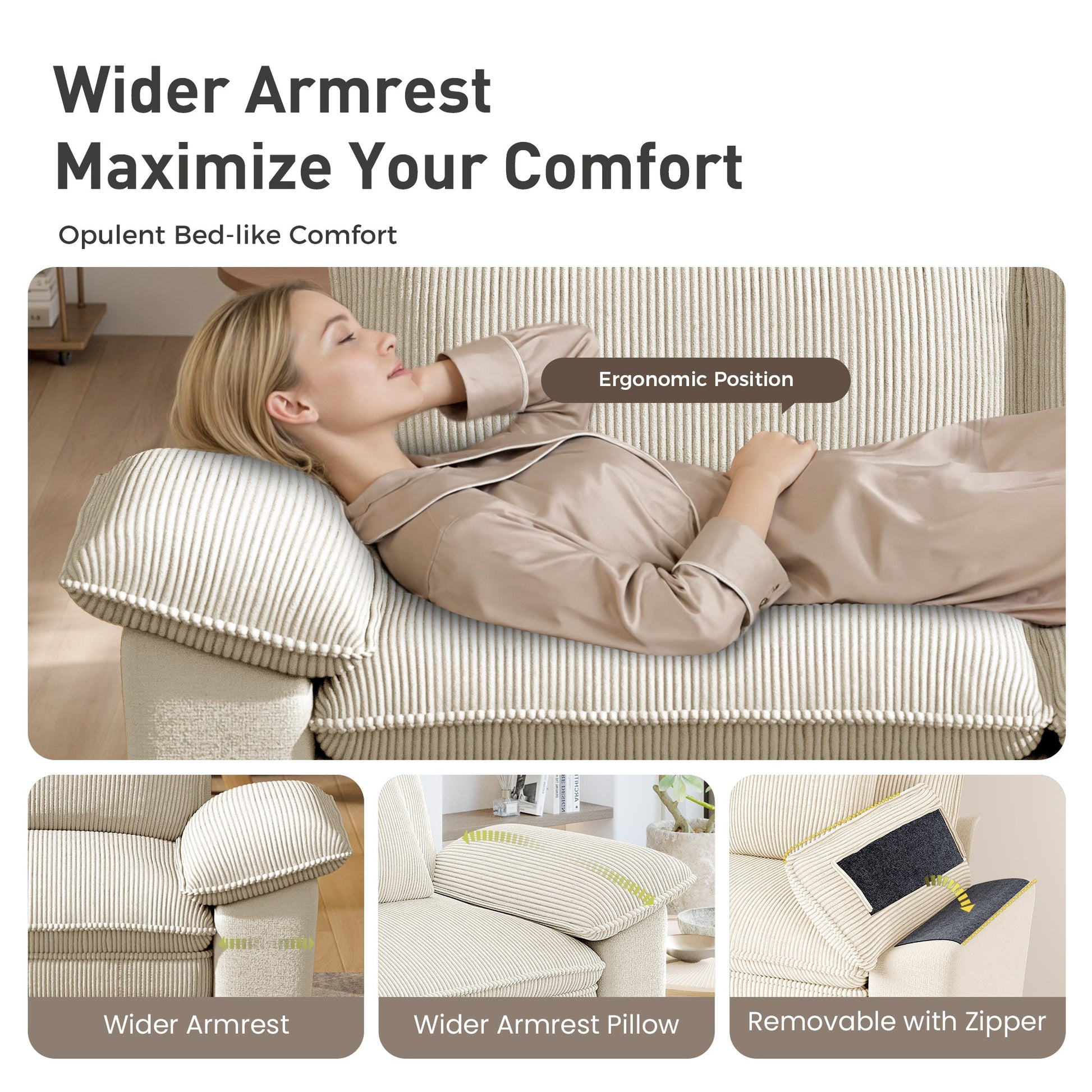 Versatile Style, Limitless Configurations: This sofa effortlessly complements any d¨¦cor from modern to Scandinavian to industrial. Mix and match the modular pieces to create your perfect layout ¨C whether it's L-shape, U-shape, sectional, or straight, the choice is yours! Cloud-Like Comfort: Experience ultimate relaxation with our 13.79" high-density support foam and soft, fluffy filling. Enjoy a weightless feel that remains supportive over time. Ergonomic armrests and detachable back pillows provide extra comfort for lounging. Solid Frame: Built to last, our durable frame resists deformation and supports up to 1,200 lbs, ensuring it stays steady and wobble-free for years. High-Density Sponge Core: Designed to retain its shape even after years of use, this sofa is crafted for long-lasting comfort. Wood Back Support Design: The contoured wood back support cradles your spine, providing lasting comfort throughout the day. Removable, Washable Covers: Cleaning is a breeze with our optional removable covers, making it easy to refresh your space with a quick style update. Anti-Scratch Metal Legs: Our stylish metal legs not only protect your floors but also add a touch of modern elegance. Perfect For: Living Rooms | Home Theaters | Office Lounges | Studio Apartments