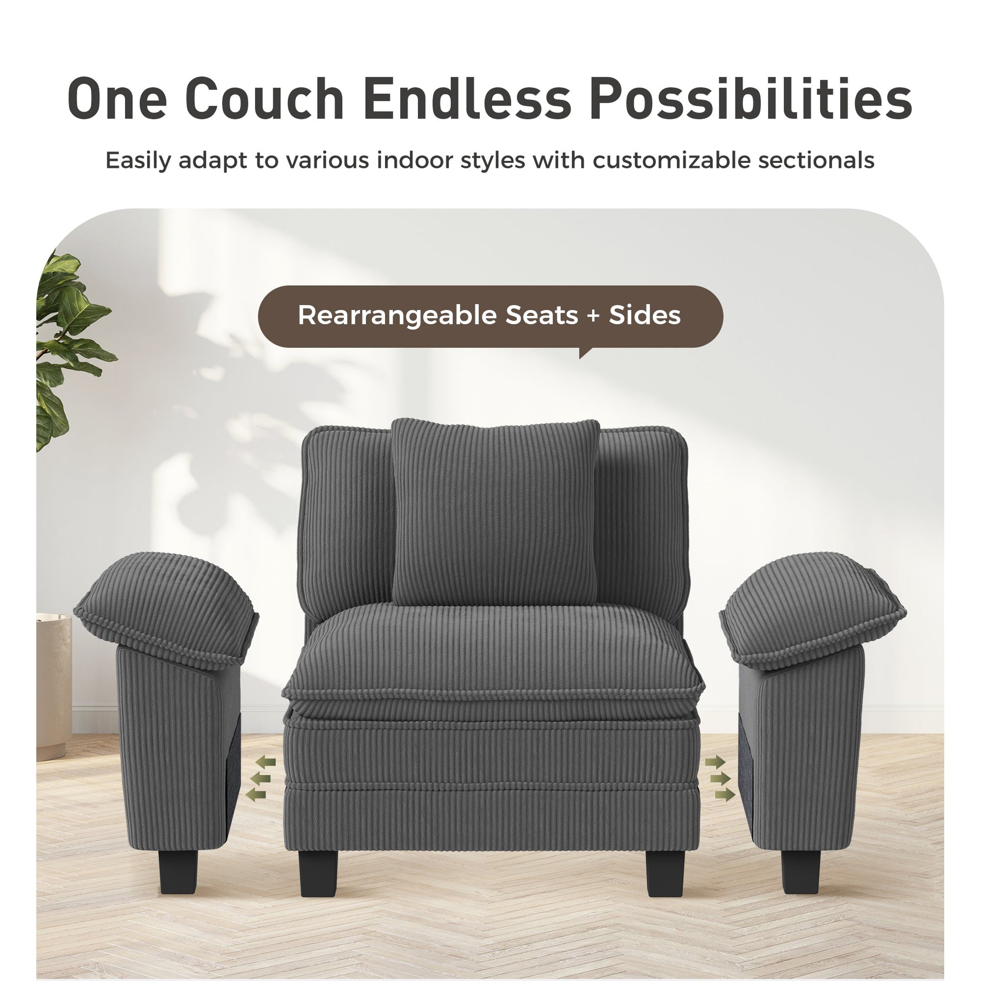 Versatile Style, Limitless Configurations: This sofa effortlessly complements any d¨¦cor from modern to Scandinavian to industrial. Mix and match the modular pieces to create your perfect layout ¨C whether it's L-shape, U-shape, sectional, or straight, the choice is yours! Cloud-Like Comfort: Experience ultimate relaxation with our 13.79" high-density support foam and soft, fluffy filling. Enjoy a weightless feel that remains supportive over time. Ergonomic armrests and detachable back pillows provide extra comfort for lounging. Solid Frame: Built to last, our durable frame resists deformation and supports up to 1,200 lbs, ensuring it stays steady and wobble-free for years. High-Density Sponge Core: Designed to retain its shape even after years of use, this sofa is crafted for long-lasting comfort. Wood Back Support Design: The contoured wood back support cradles your spine, providing lasting comfort throughout the day. Removable, Washable Covers: Cleaning is a breeze with our optional removable covers, making it easy to refresh your space with a quick style update. Anti-Scratch Metal Legs: Our stylish metal legs not only protect your floors but also add a touch of modern elegance. Perfect For: Living Rooms | Home Theaters | Office Lounges | Studio Apartments