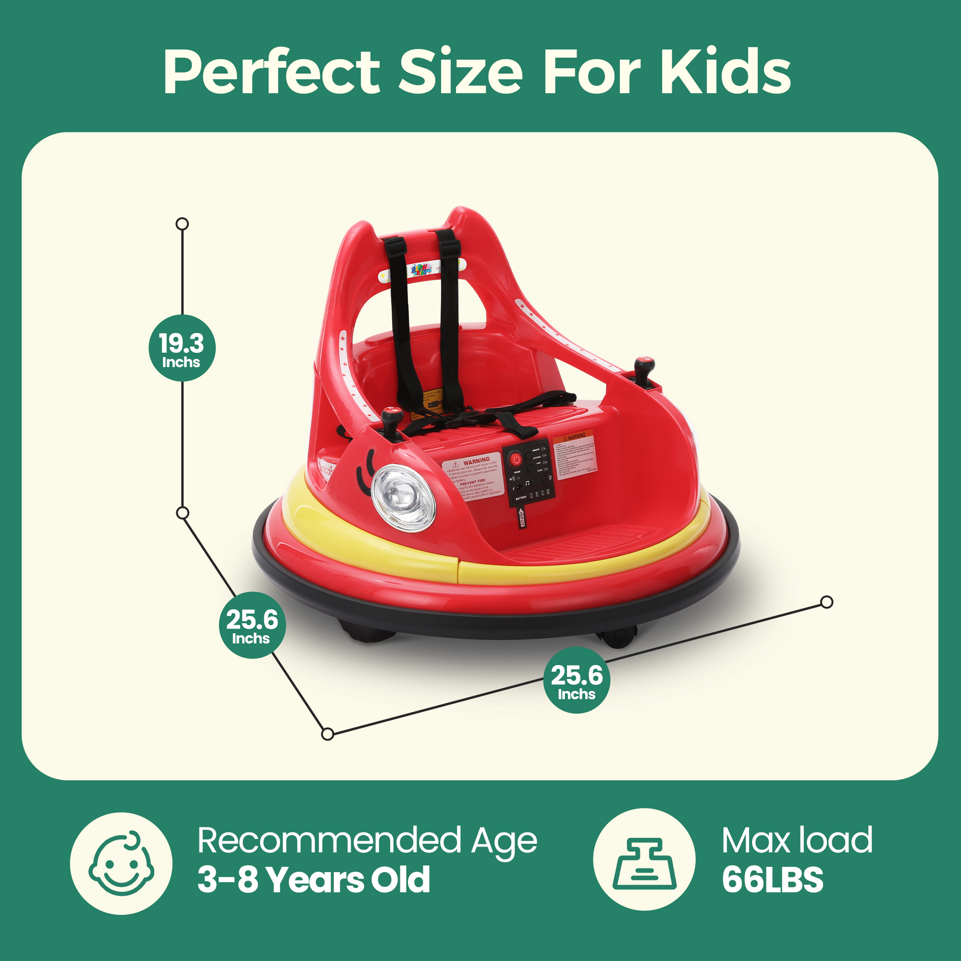 " ¡¾Certified Safety¡¿:It is certified by CPC safety standards, providing additional assurance of its safety and quality for children. With a full-circle anti-collision bar and 5-point adjustable seat belt, ensuring it meets the highest safety standards. ¡¾2 Driving Modes & Parent Control¡¿:Kids can have a blast with the exciting 360¡ã spinning feature while choosing between two driving modes: independent joystick control or parent-assisted remote steering. The bumper car is equipped with smooth double motors and offers two-speed settings, making it ideal for both indoor and outdoor fun. This versatility ensures that children can enjoy their thrilling rides in a safe and controlled manner! ¡¾LED Lights & Bluetooth Music¡¿:The bumper car features a dazzling array of colorful LED lights that create a visually stunning experience for kids. The intuitive center console allows for easy control of music, lights, and speed, with Bluetooth connectivity that enables children to enjoy their favorite tunes while driving happily. ¡¾12V Large Battery¡¿:Powered by a 12V 4.5AH rechargeable battery, this bumper car offers extended playtime, ensuring that your child can enjoy longer rides without interruption. ¡¾Ideal Gift for Kids¡¿:It's suitable for children aged 37 to 96 months old, freely ride indoor and outdoor. Perfect for birthdays, and momentous celebrations, while also fostering children's development and parent-child interaction.