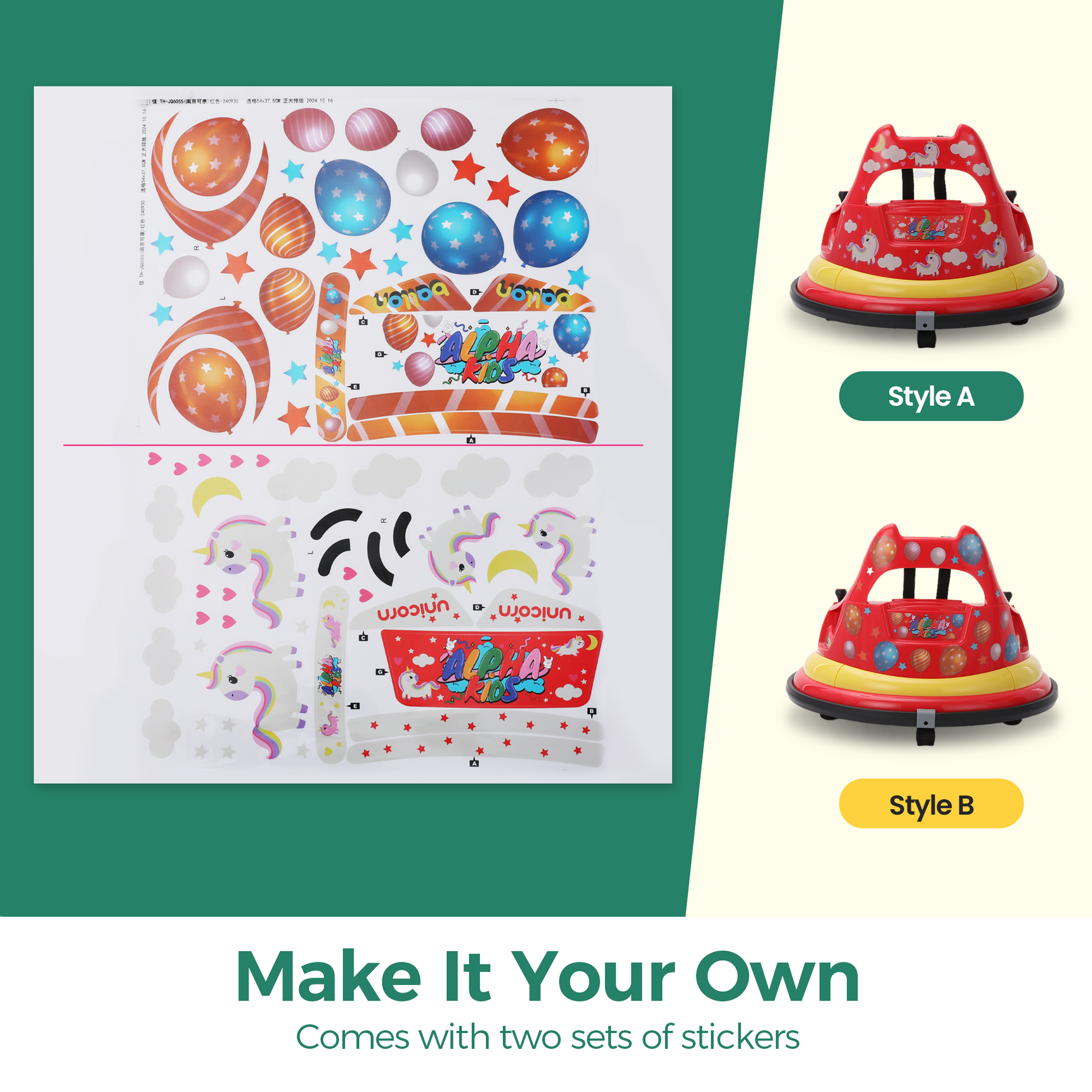 With the ability to rotate 360 degrees, kids can explore every angle of driving, adding to the thrill of their adventure. Safety is prioritized with the inclusion of seat belts and anti-collision strips, ensuring a secure ride. Additionally, the car comes with a remote control for parents, providing extra reassurance while their children enjoy an exhilarating ride, and 2 stickers to personalize the ride as well.