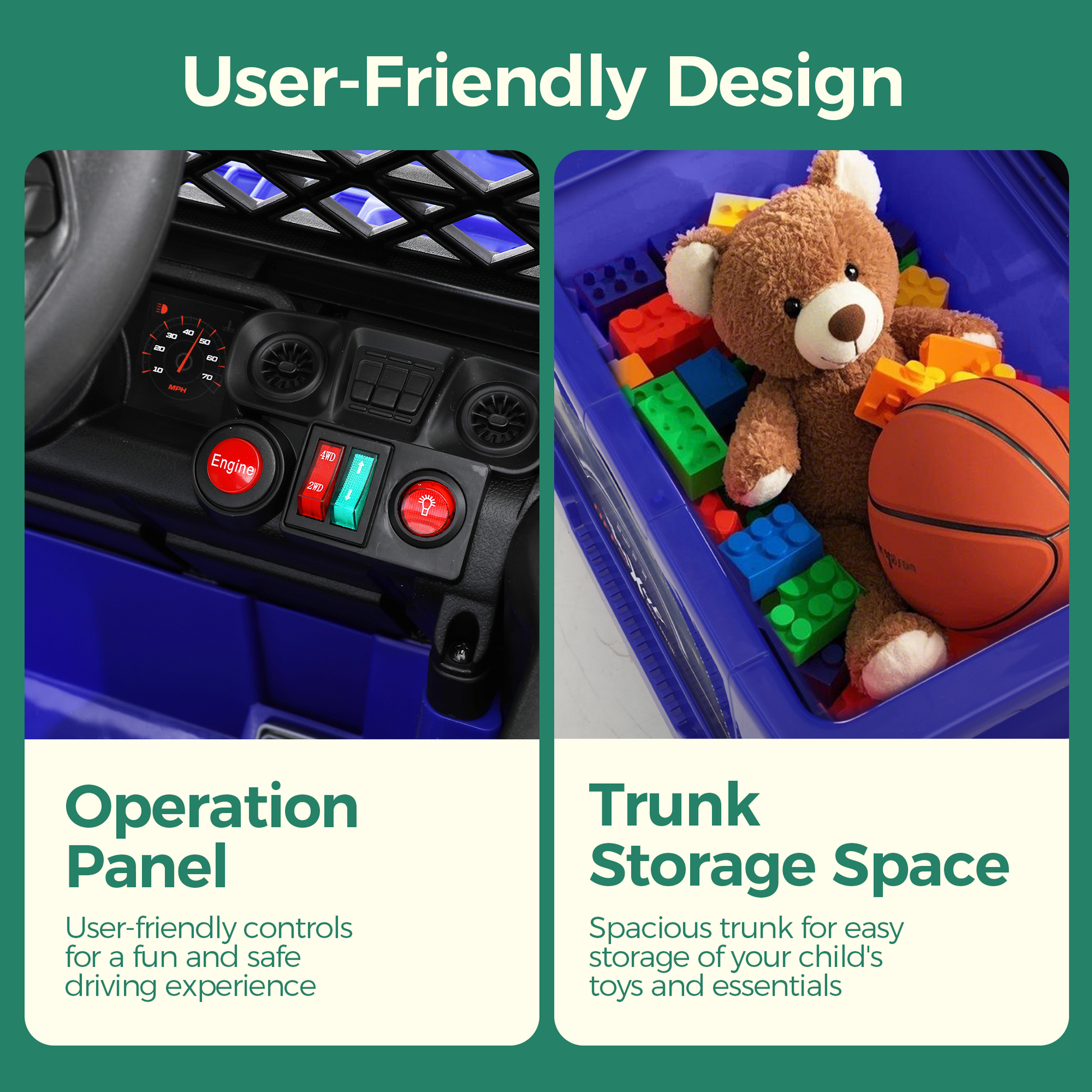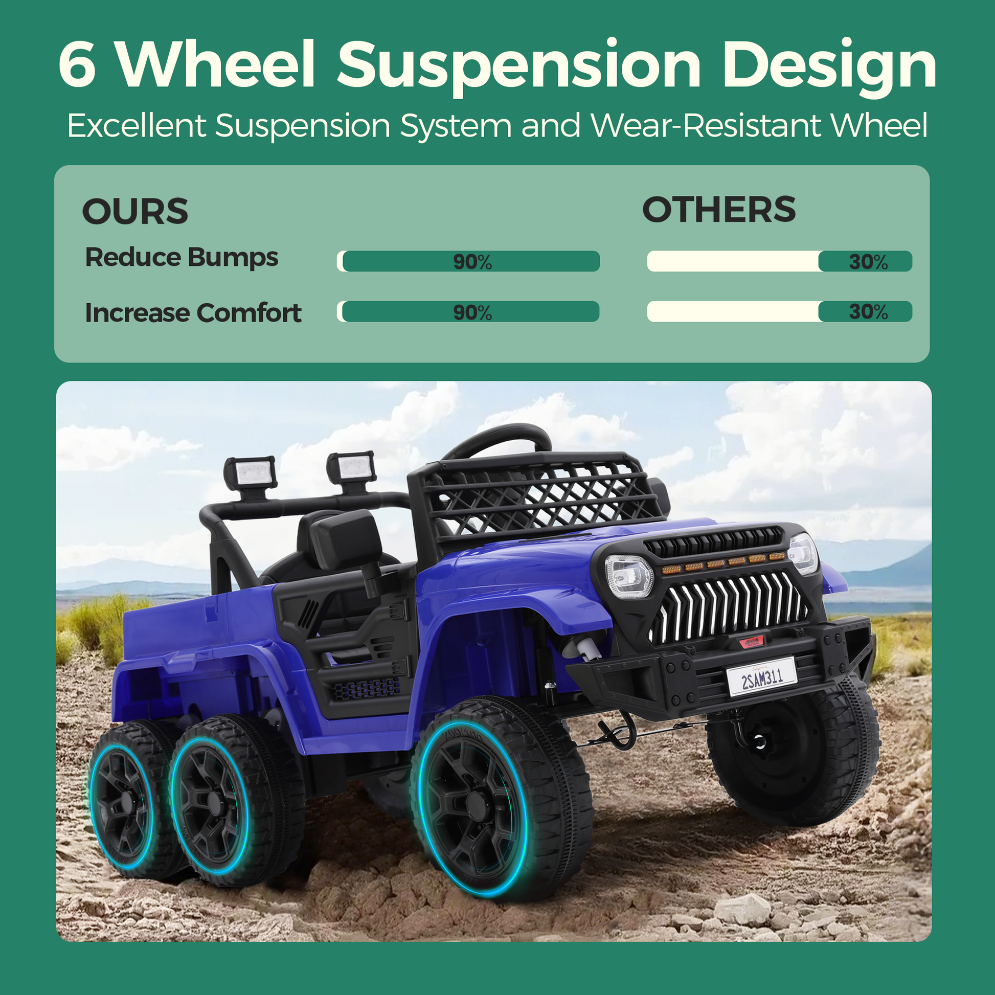 This thoughtful ride-on car is equipped with locking doors, a foot pedal, wear-proof tires, a seat belt, and LED lights, ensuring safety and enjoyment. Additionally, it boasts four large wheels for stability. The high-end features include one-button soft-start technology, a switch for forward and reverse, and a spring suspension system, enhancing the overall driving experience for both kids and parents alike." ¡¾Certified Safety¡¿:It is certified by CPC safety standards, providing additional assurance of its safety and quality for children. It features 6-wheel shock absorption? and stable handling, allowing parents to easily control speed for a ?safe electric car for kids?, and supports a weight capacity of up to 66lbs, making it suitable for kids aged 3 and above. Its robust design ensures that young riders can enjoy a safe and exciting driving experience as they embark on their adventures! ¡¾2 Driving Modes & Parent Control¡¿:Kids can steer independent with joystick control; or parents can take full control with the 2.4G parental remote, which features essential functions including forward and reverse driving, as well as an emergency stop. ¡¾Attractive Entertainment¡¿: Includes music, Bluetooth connectivity, and a built-in radio, making kids enjoy their favorite tunes through high-quality speakers while driving. The bright LED headlights, along with two detachable spotlights, enhance visibility and add a fun flair, making every adventure exciting whether it's day or night. ¡¾12V Large Battery¡¿:Powered by a 24V 4.5AH rechargeable battery, this truck offers extended playtime, ensuring that your child can enjoy longer rides without interruption. ¡¾Ideal Gift for Kids¡¿:It's suitable for children over 3 years old, freely ride indoor and outdoor. Perfect for birthdays, and momentous celebrations, while also fostering children's development and parent-child interaction.