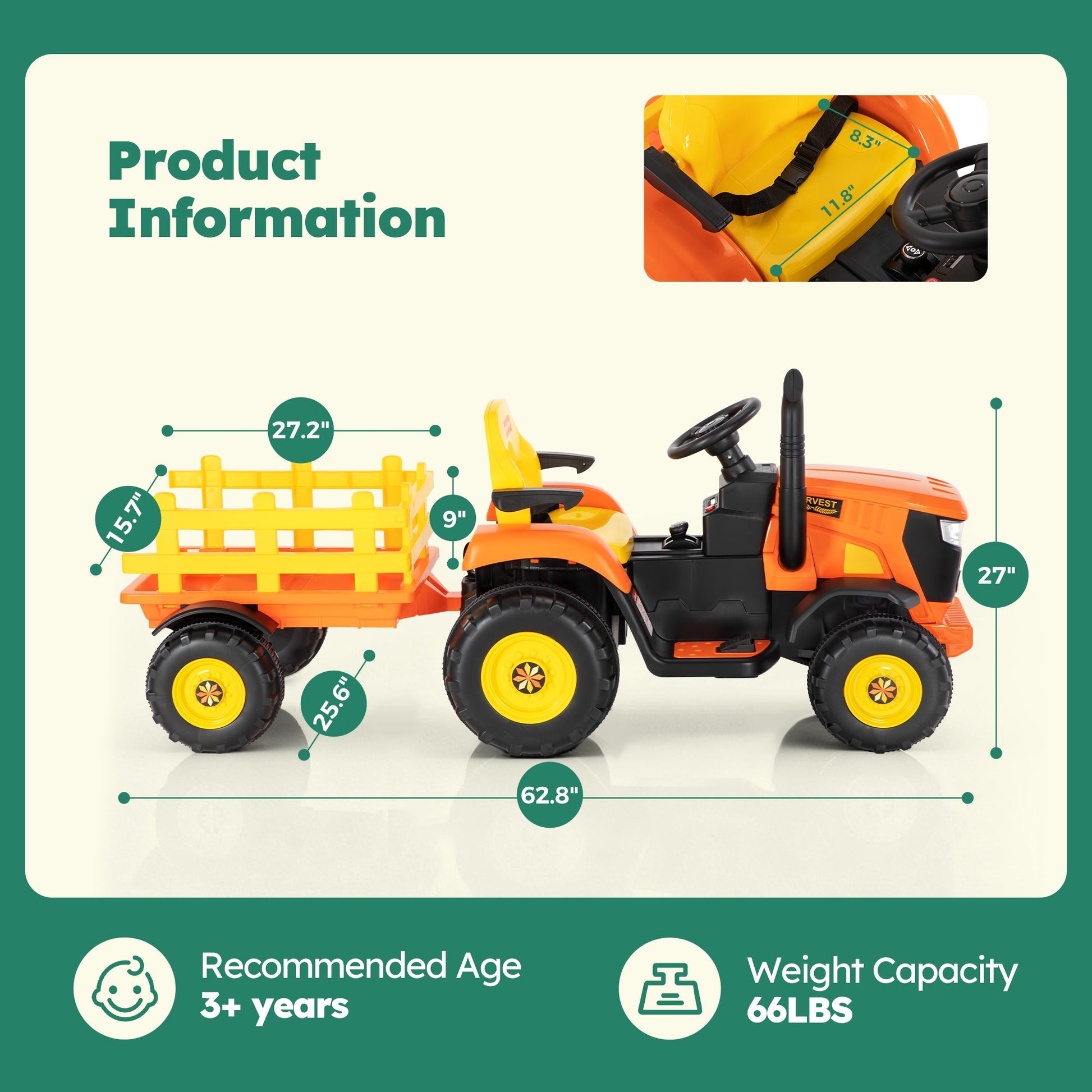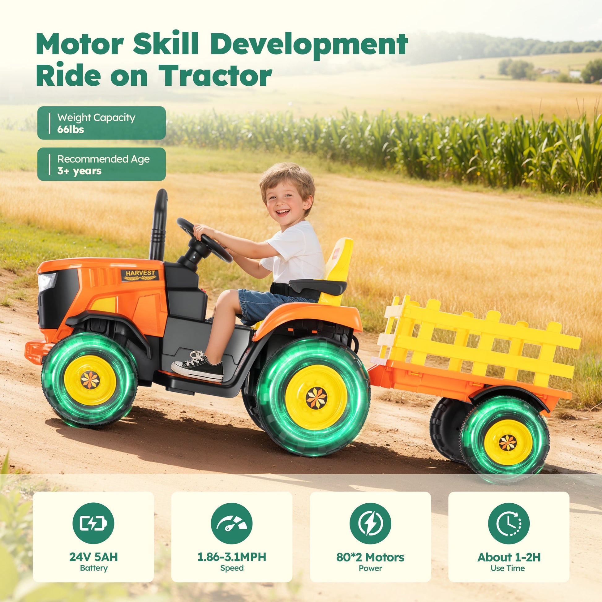 24V Large Battery:Powered by a 24V 5AH rechargeable battery, this tractor car offers extended playtime, ensuring that your child can enjoy longer rides without interruption.ps: The first charge takes 10 hours, and the normal charging time thereafter is 8-12 hours. Ideal Gift for Kids:This ride-on tractor with trailer is suitable for children aged 3 years and older, featuring adjustable armrests and realistic functions for an authentic driving experience. Kids can freely ride it both indoors and outdoors, making it the perfect gift for birthdays and other special celebrations. It not only provides endless fun but also fosters children's development and encourages valuable parent-child interaction.