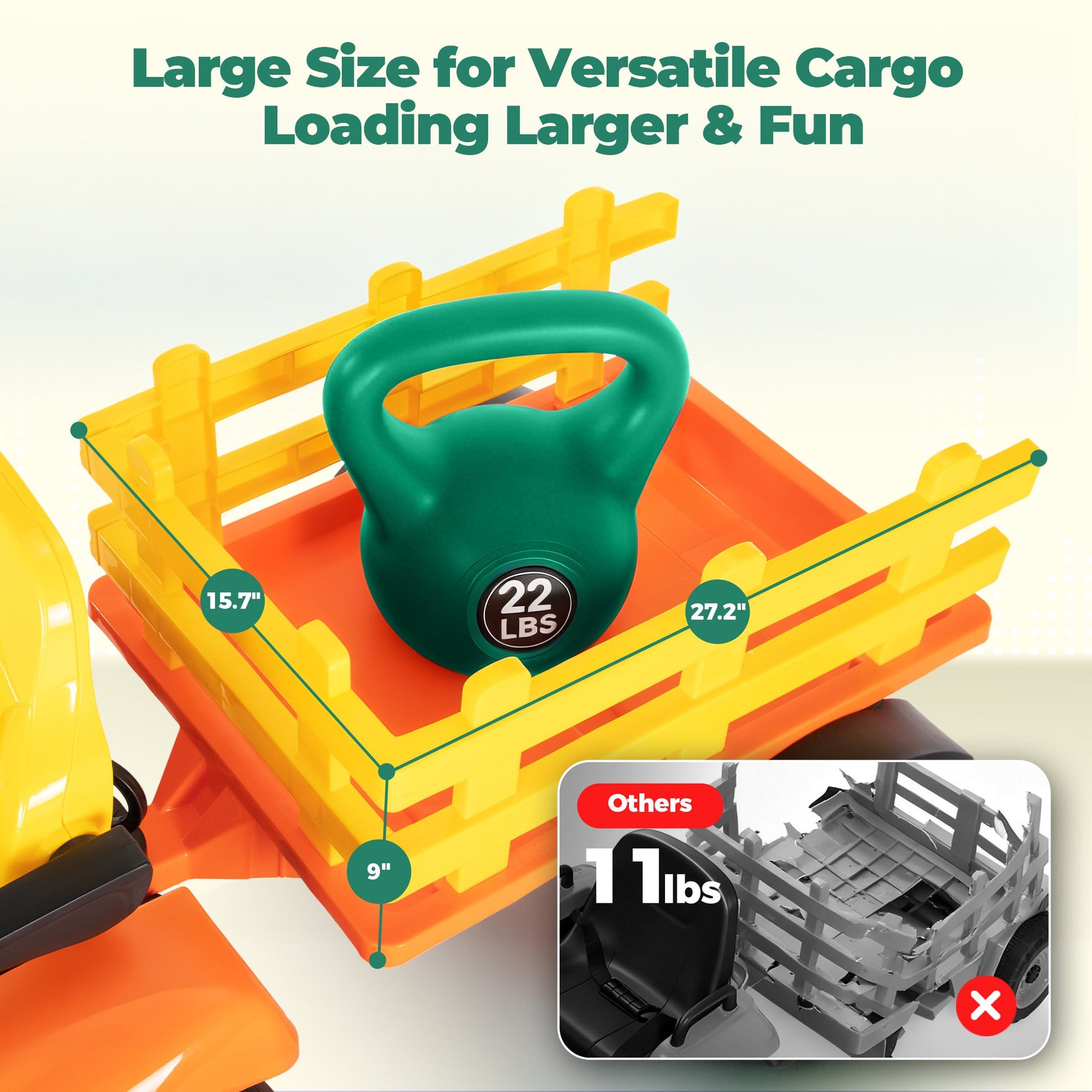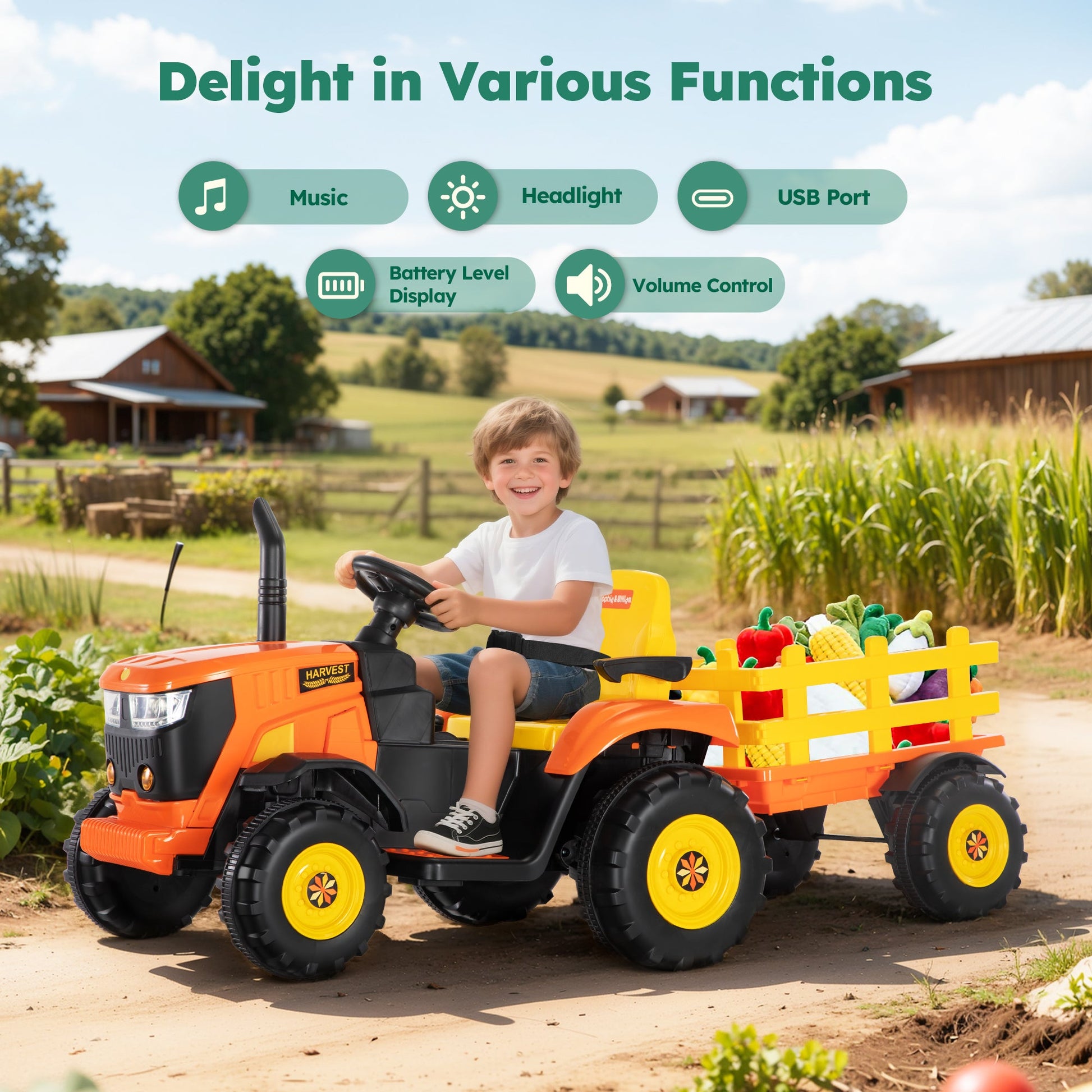 Tippable & Detachable Trailer: This electric ride-on tractor is equipped with a large detachable trailer that can carry up to 22 lbs of heavy items such as toys, flowers, straw, and more. With this fun vehicle, children can help clean the garden alongside their parents, creating delightful bonding moments and fostering teamwork during playtime.