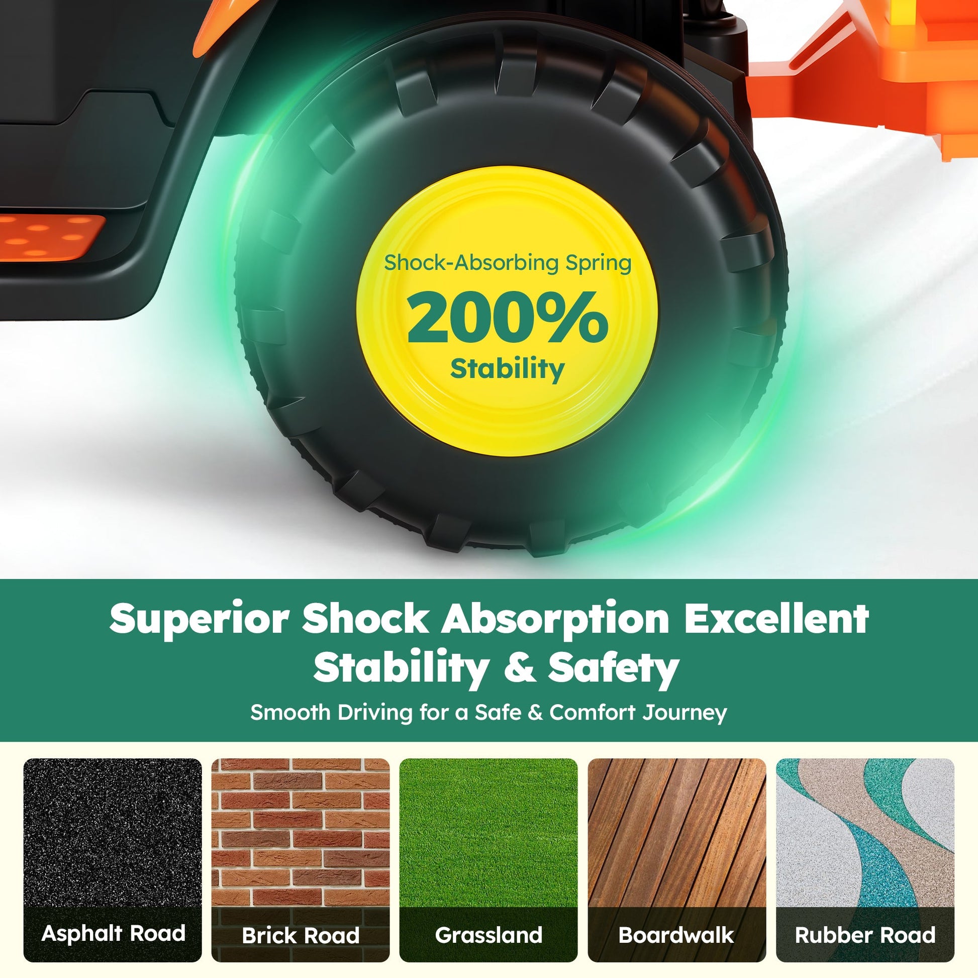 Safety and Durability: This ride-on tractor is crafted from high-quality PP material, providing a superior texture and enhanced body strength for lasting durability. The spacious seats come equipped with safety belts to ensure your child's security while driving. Additionally, the upgraded EVA wheels offer superior shock absorption, allowing for a smooth and stable ride on any terrain, including an 8¡ã slope.