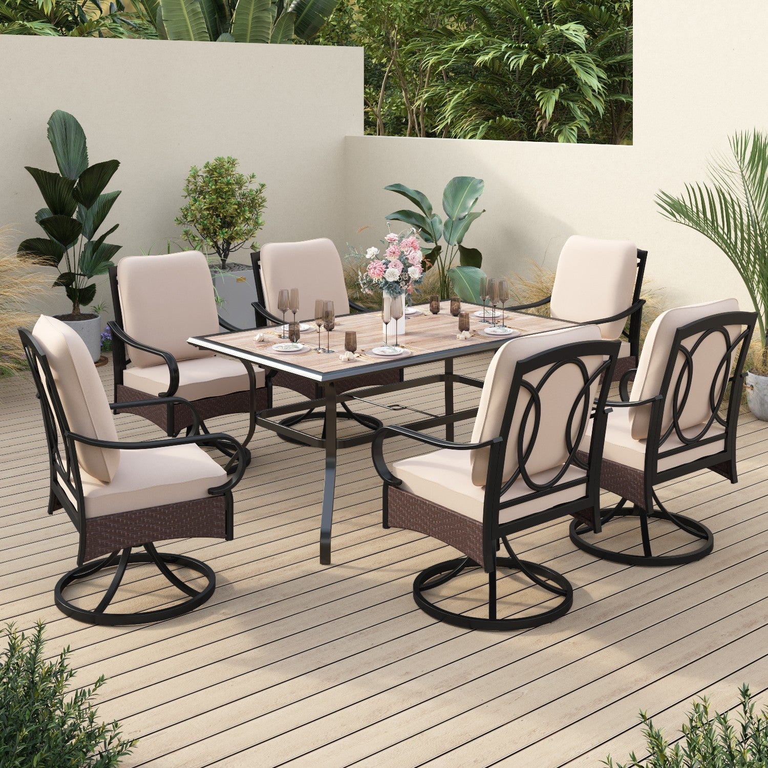 - Patio dining set includes 1pc 6-seat table and 6pcs swivel chairs