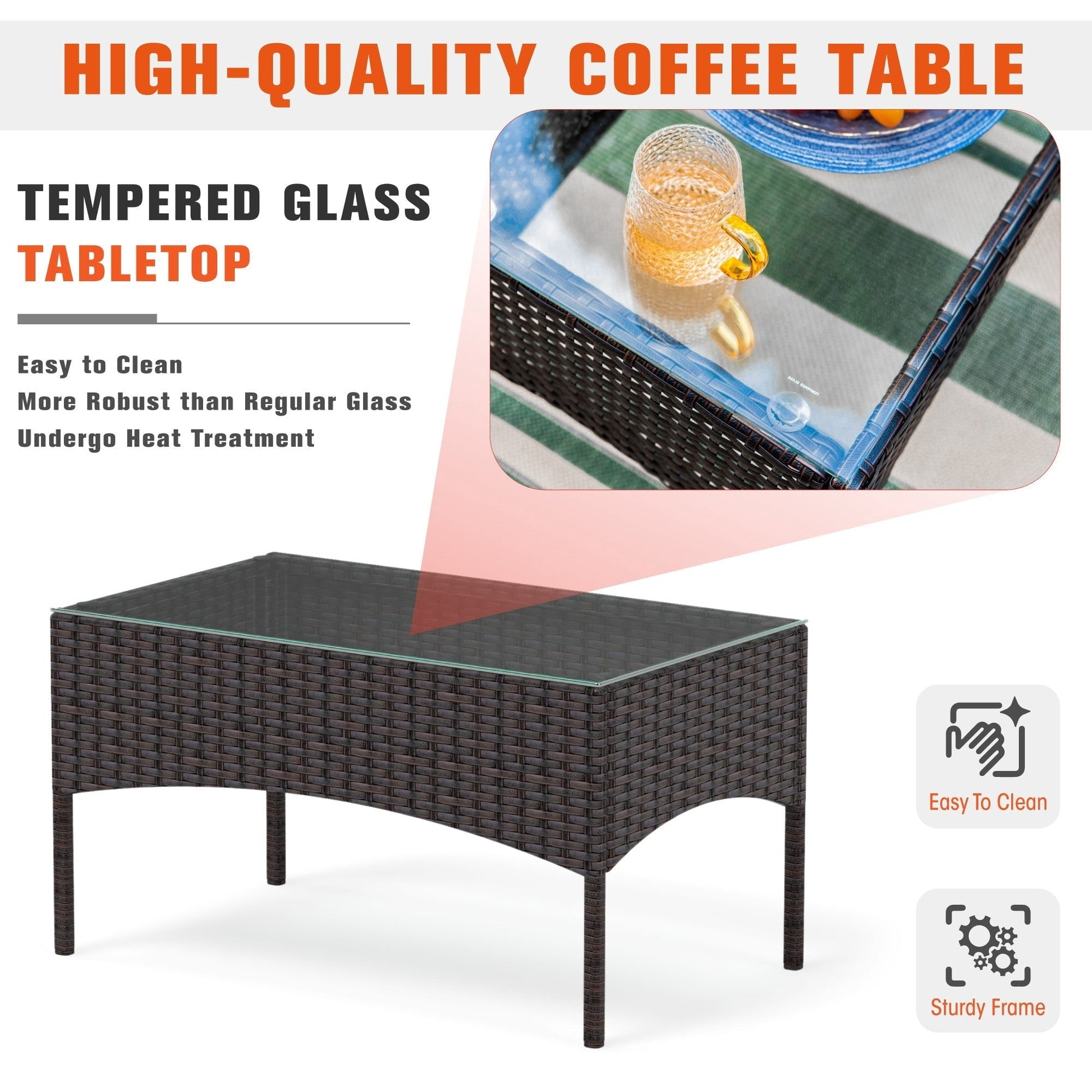 【Effortless Upkeep for Wicker Porch Furniture】- Keeping this wicker rattan furniture looking its best is a breeze, requiring only occasional spot cleaning with a damp cloth, water, and mild soap. The table's glass surface and cushions are washable, maintaining the allure of this wicker patio furniture set.