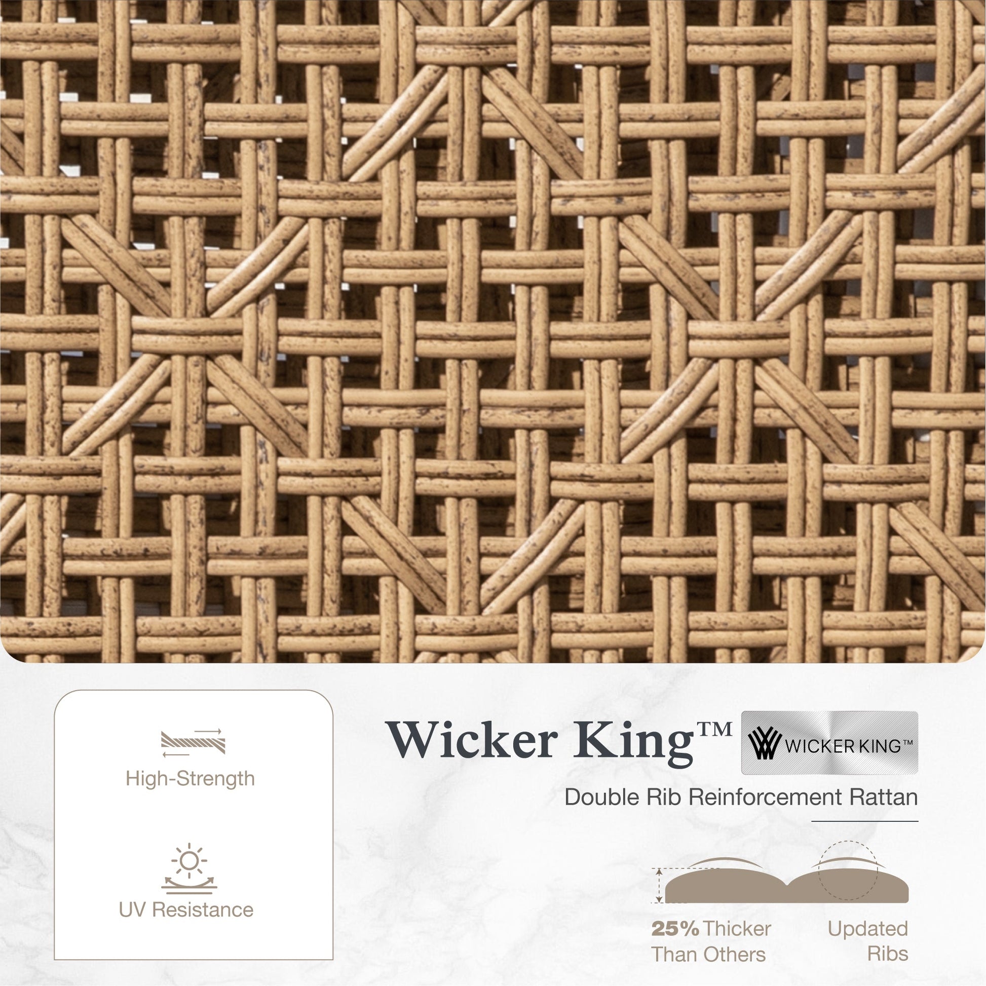 Enhance your outdoor living space with Alpha Joy Bohemian Style Wicker Conversation Patio Set, combining chic aesthetics and comfort. The handcrafted diamond hollow patterns in tightly woven wicker and plush beige cushions create a stylish, inviting atmosphere for your patio, balcony, or garden. Designed for comfort, the wide back and deep seat allow for hours of relaxation, complemented by thick 3.15" cushions. The coffee table features a durable polymer wood surface supported by natural acacia wood legs, adding a warm touch. With Wicker King? technology, this set is built to withstand the elements, ensuring lasting beauty and enjoyment for all your outdoor gatherings.