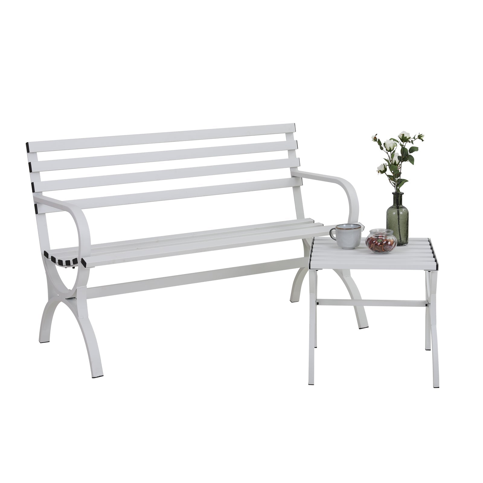 Sophia & William 2 Pieces Metal Outdoor Garden Bench with Side Table - White