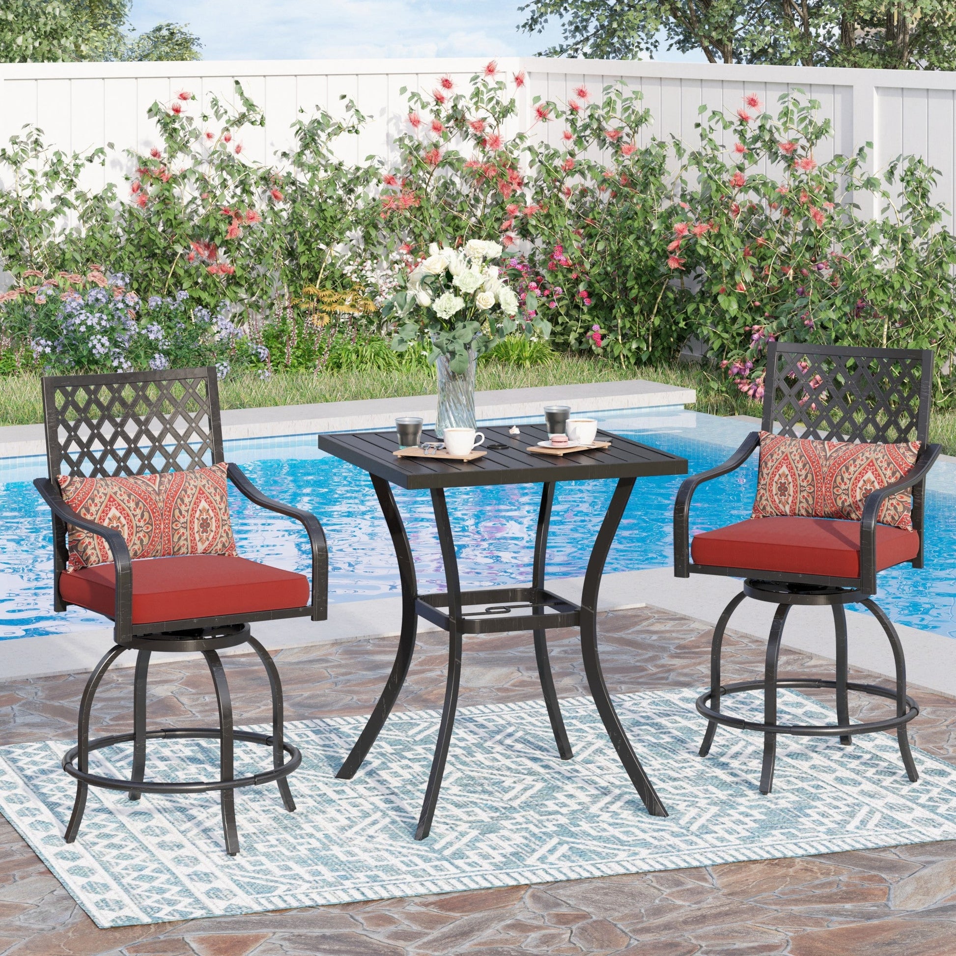 - Patio dining set includes 1pc square height bar table and 2pcs swivel bar stools