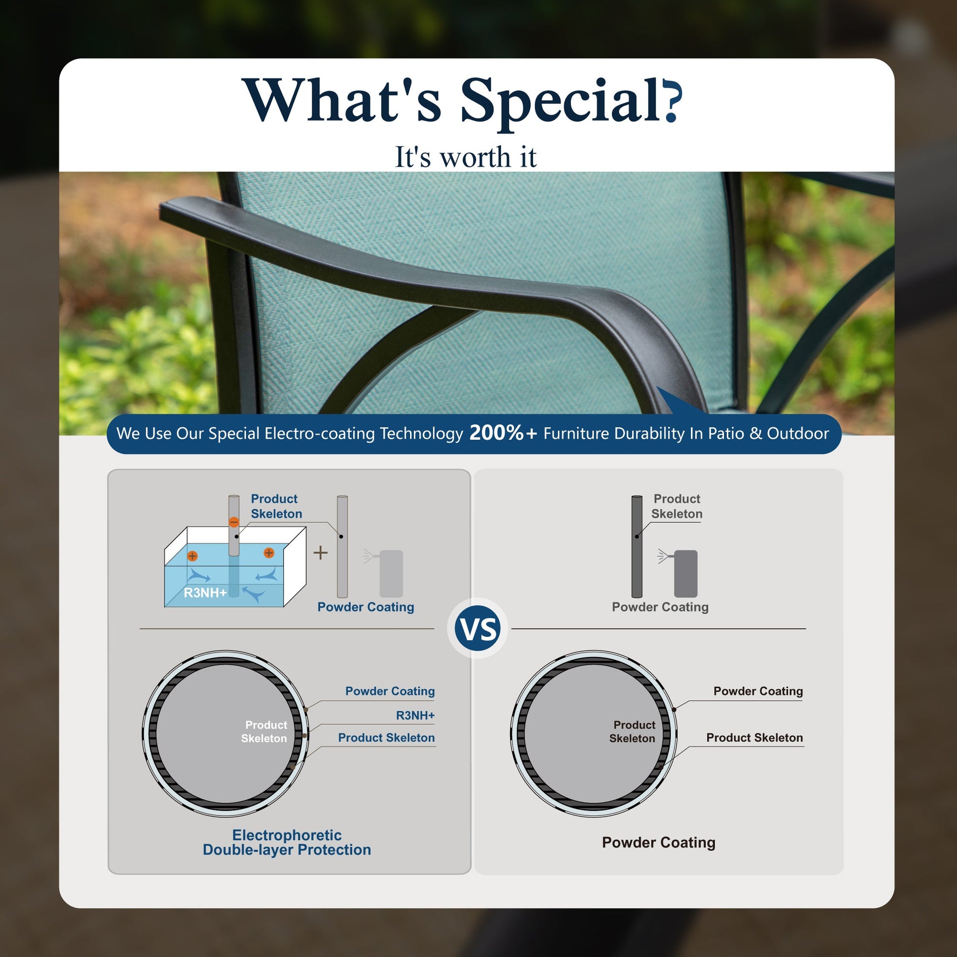 ¡¾Sturdy & Durable Material¡¿: Crafted with powder-coated steel frame and breathable sling fabric to ensure durability, rust resistance and weather resistance. Steel framed outdoor furniture has high intensity and heavier weight capacity, it does not change shape easily, featuring deformation resistant.