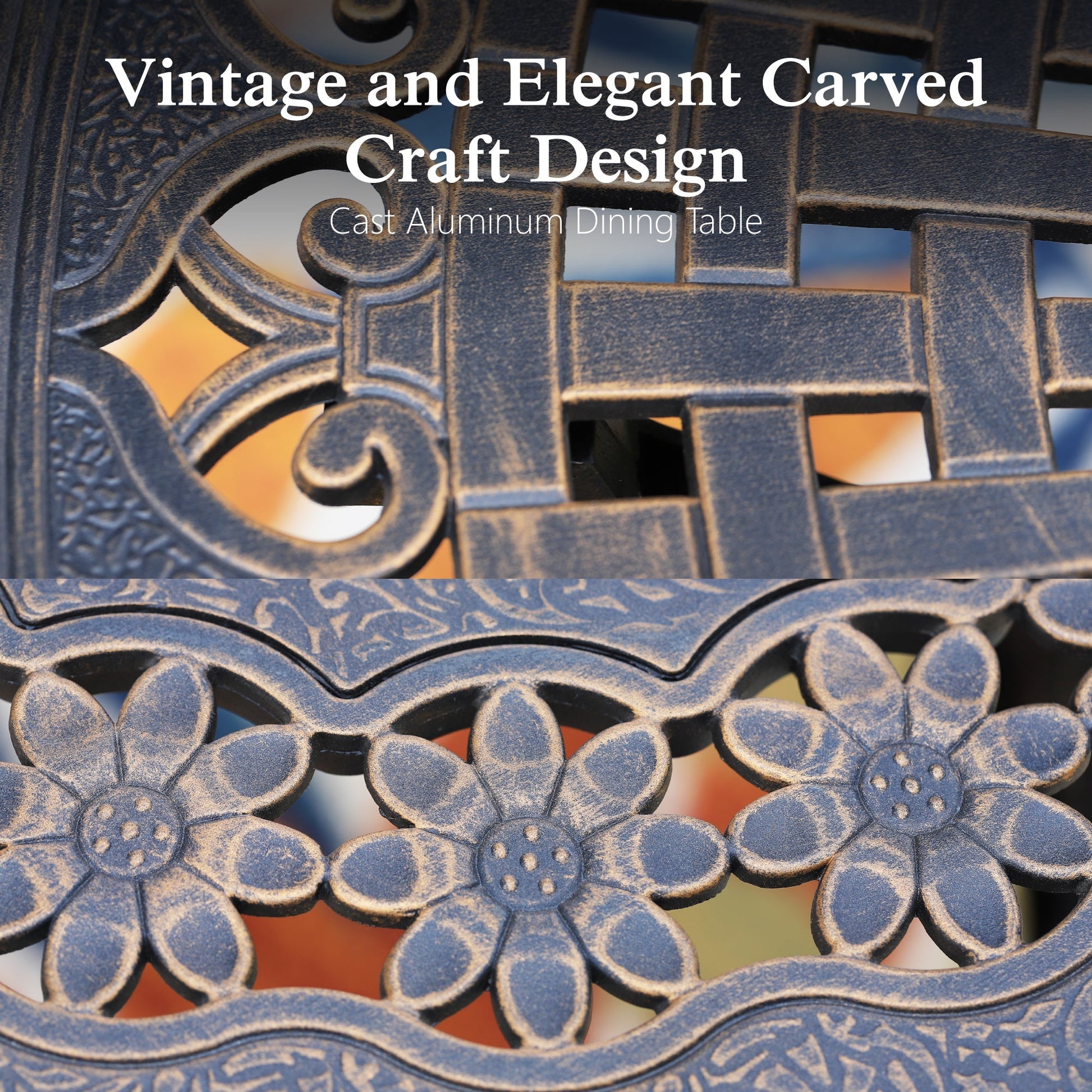 This set includes 5Pcs cushioned wicker rattan chairs and 1Pc table. Our round cast aluminum table effortlessly seats 4. Crafted for durability, it features a unique pattern design, exuding vintage charm. The rust-resistant, radiation-resistant, and easy-to-clean black surface ensures long-lasting elegance and protection.