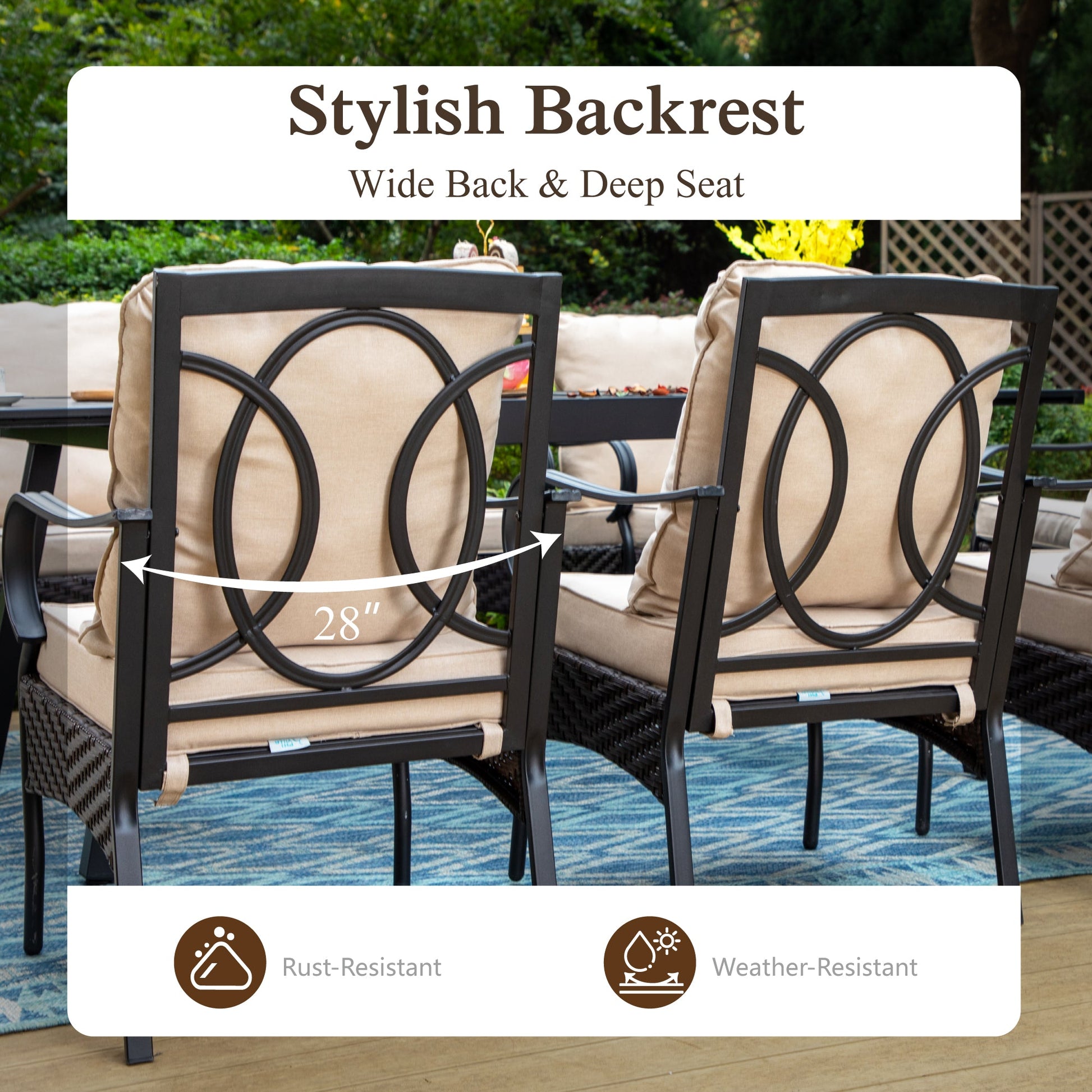 ¡¾E-coating Steel Frame¡¿: This outdoor dining chair is constructed with a durable heavy-duty steel frame that utilizes e-coating and powder-coating methods to resist rust and corrosion. It is easy to clean and does not need any special maintenance. The chair is designed to accommodate most individuals and can support up to 300 lbs, ensuring both reliability and comfort for outdoor dining. ¡¾CUSHION PRO Technology¡¿: Our patented Cushion Pro outdoor fabric features remarkable water-repellent, soil-release, and stain-resistant capabilities. When it becomes soiled, it can be easily cleaned with a wipe and is designed to withstand all weather conditions. ¡¾Cushioned Chair¡¿: The super comfortable and soft springy sponge beige cushion provides added comfort to this chair. With smooth armrests and a sleek backrest, helps alleviate muscle tension and stress, providing an ideal setting for relaxation and comfort. The elegant wicker rattan surrounding enhances its aesthetic appeal, making it a perfect addition to any space where you seek tranquility and comfort. ¡¾Metal Table¡¿: This table features a heavy-duty steel frame with e-coating and powder-coating techniques for rust and corrosion resistance; it is easy to clean and requires no special care. The table has a 1.57"-1.9" diameter umbrella hole that fits most umbrellas on the market, along with a bottom hole to secure the umbrella in place, offering maximum shade when needed. The stylish modern slatted metal tabletop design makes it a fantastic addition to your patio, porch, and backyard. ¡¾Indoor/Outdoor Use¡¿: Our patio dining set is suitable for outdoor garden balcony, deck, park, patio, porch, poolside, or yard, as well as for indoor use in kitchens or living rooms during dinner time. ¡¾Timely Customer Service¡¿: Due to the large volume of the item, this set will be shipped in different packages; delivery times may vary per box. If you encounter any issues such as missing parts or damage, please do not hesitate to contact us for support.